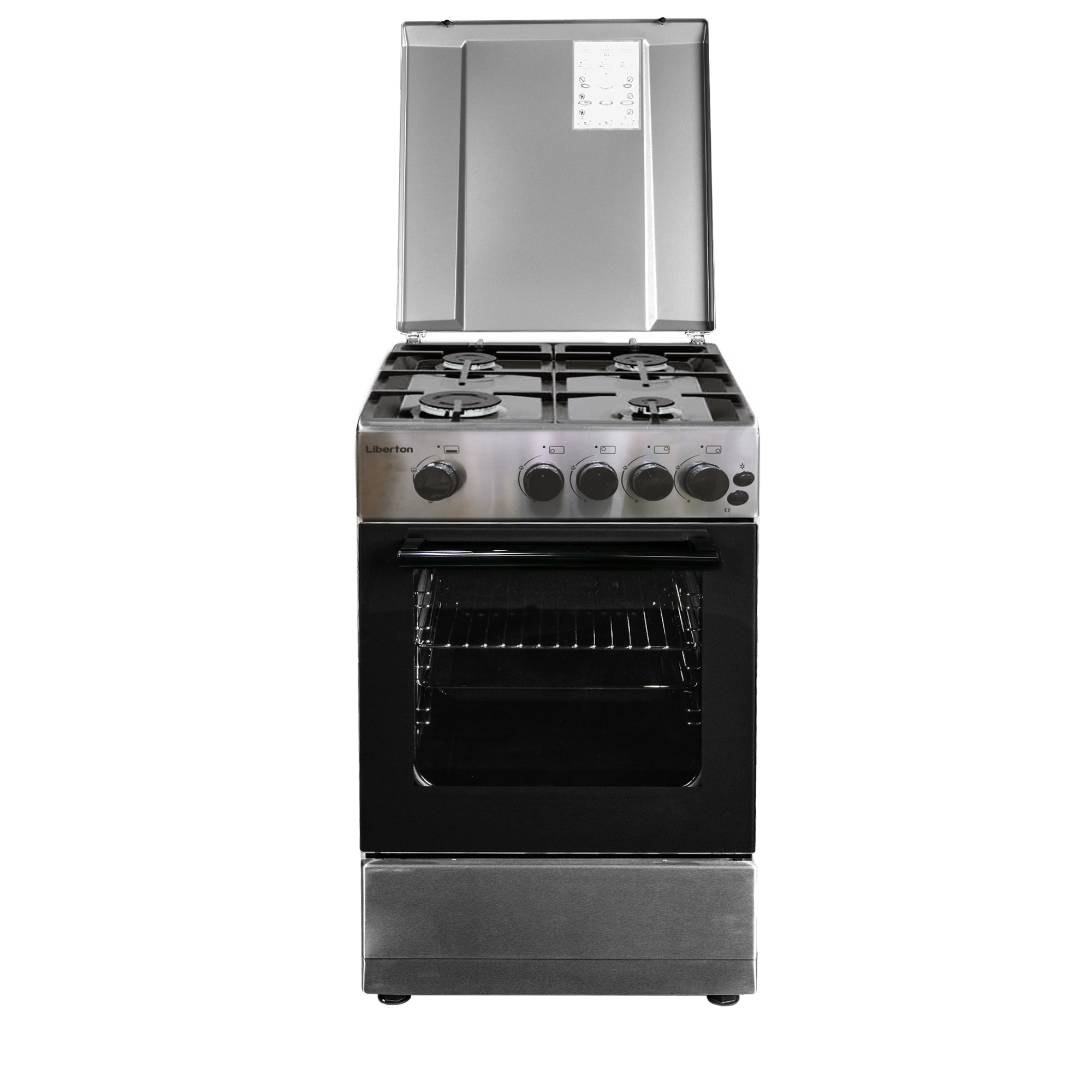 Тип: комбінована; Тип варильної поверхні: газова; Тип духовки: газова; Управління: механічне; Покриття варильної поверхні: нержавіюча сталь; Матеріал решіток: чавун; Кількість газових конфорок: 4; Автопідпал: кнопка; Безпека: газ-контроль варочна поверхня, духовка; Об'єм духовки: 58 л; Скло дверей: подвійне; Конвекція: немає; Гриль: немає; Підсвічування: так; Таймер: немає; Аксесуари в комплекті: решітка, деко; Ящик для приладдя: так; Кришка: скляна; Регульовані ніжки: так; Розмір виробу, Ш×Г×В см: 50х60х85; Колір: нержавіюча сталь.