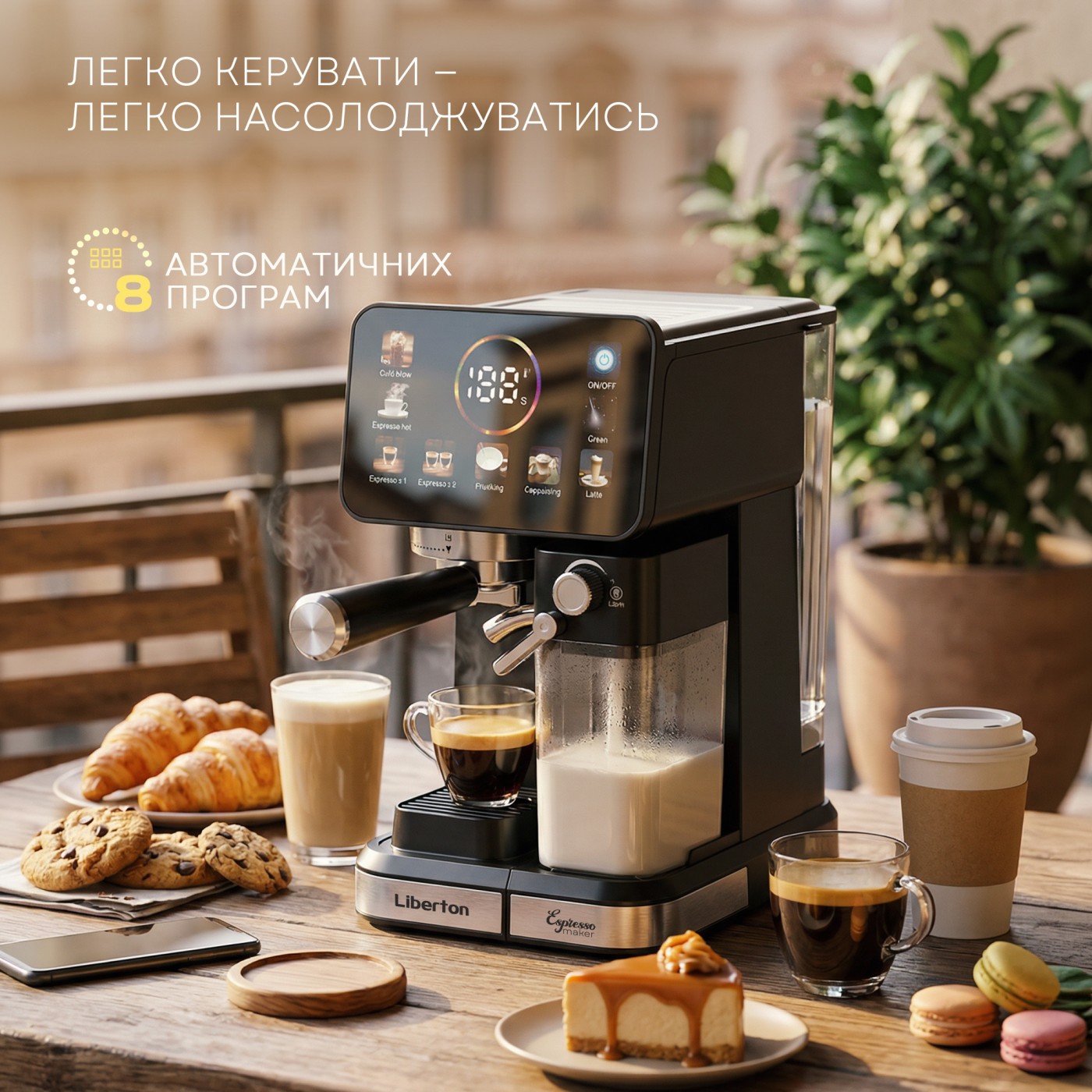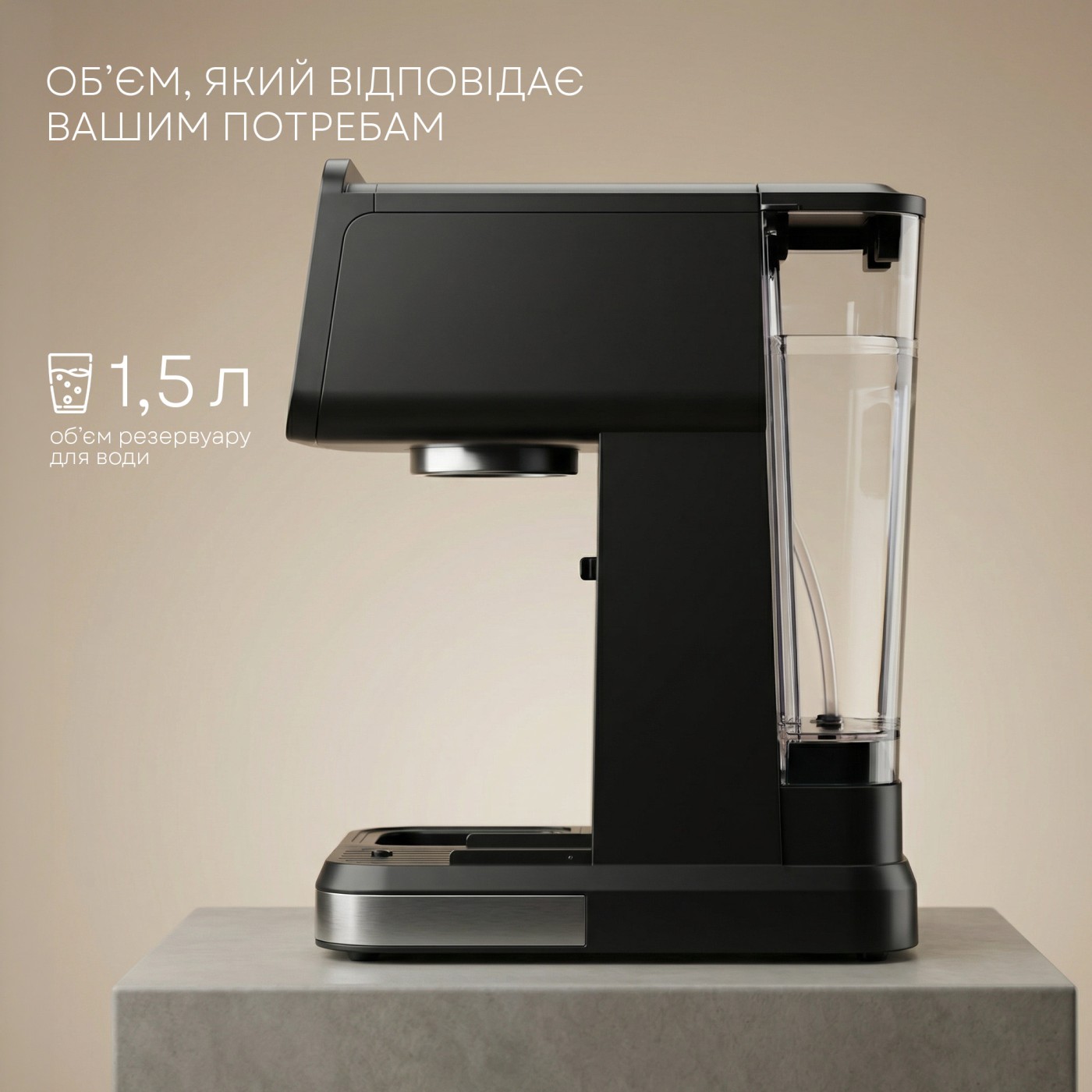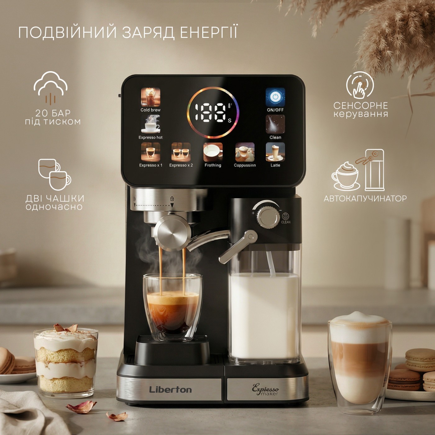 Power: 1350 W; Pressure: 20 bar; Control type: touch (automatic); Water tank capacity: 1.5 L; Coffee type: ground coffee; Features: overheat and overpressure protection, panarello steam wand, steam control, hot water dispensing, milk-based drinks preparation, simultaneous brewing of 2 espresso cups, hot espresso, cold espresso, preparation of Americano, cappuccino and latte (automatic mode), fast water heating system with thermoblock, descaling reminder, cup warmer, measuring spoon with tamper included; Body material: plastic + stainless steel; Product dimensions (W×H×D), cm: 19.7×33.5×26.4; Color: black + silver.