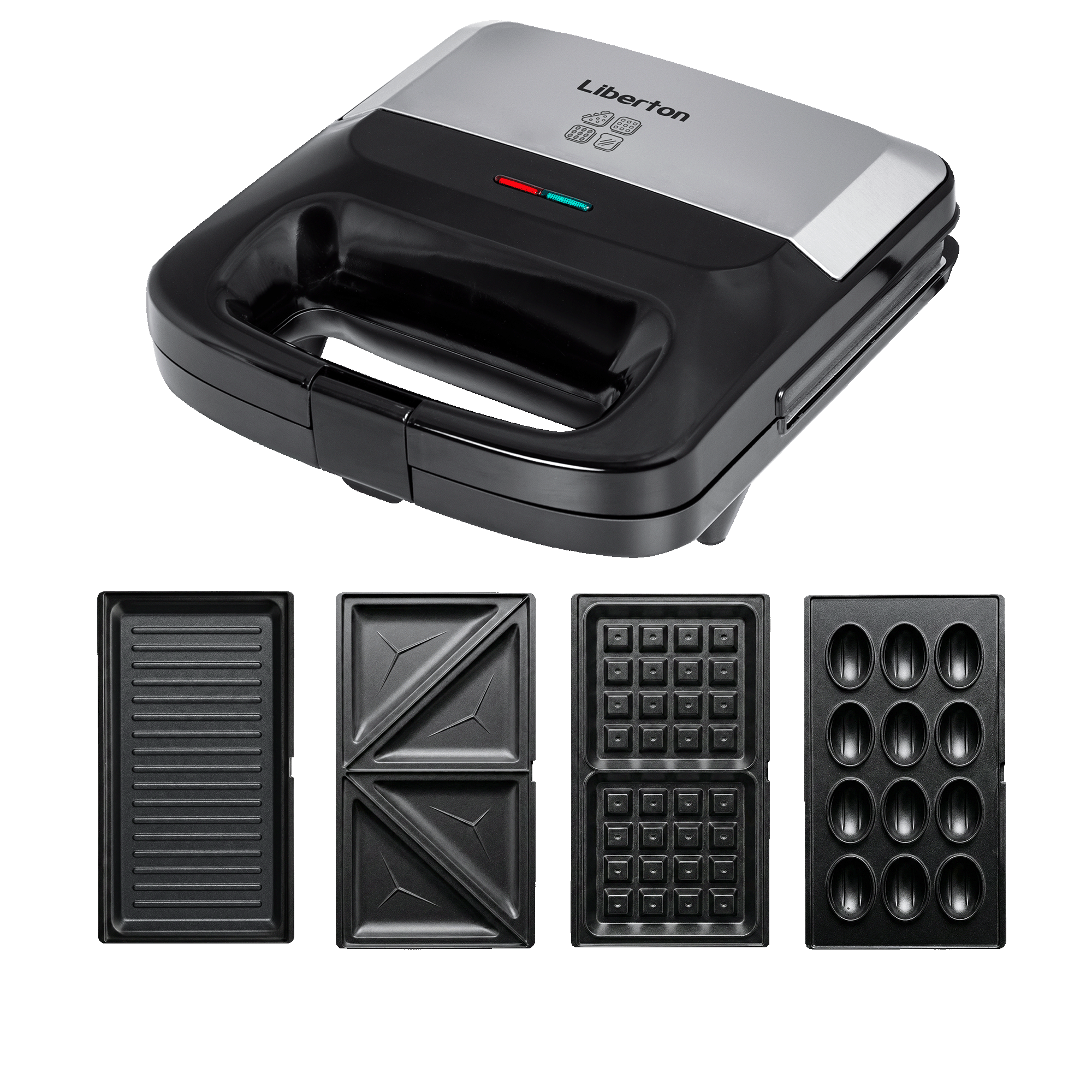 Power: 800 W; 4 in 1; Plate: grill, Belgian waffles (2 pcs.), triangular sandwiches (4 pcs.), hazelnut (12 pcs.); Power and food readiness indicator; Automatic temperature control; Plate coating: non-stick; Working surface size: 21.6x12 cm; Case material: bakelite; Product size: 22.1x9.3x23 cm; Black color.