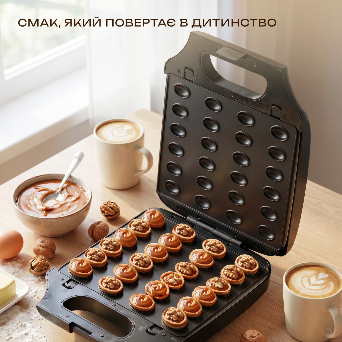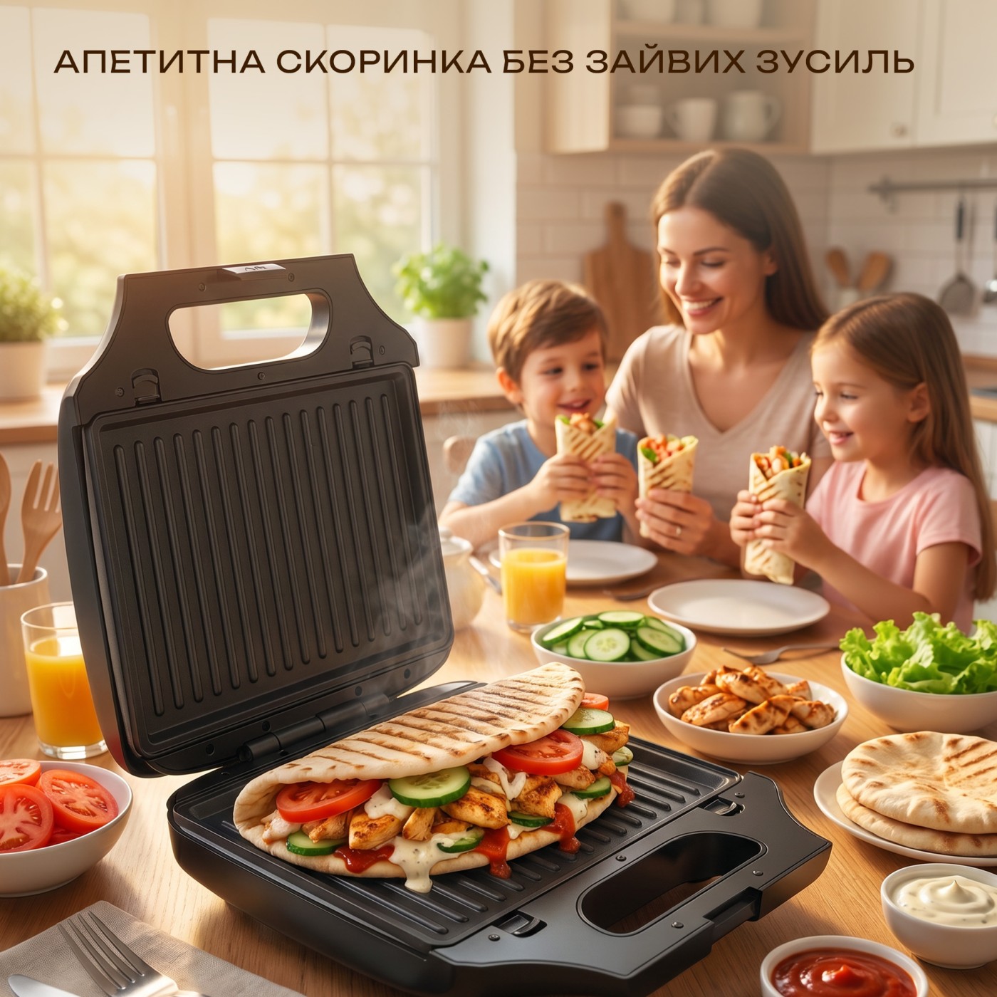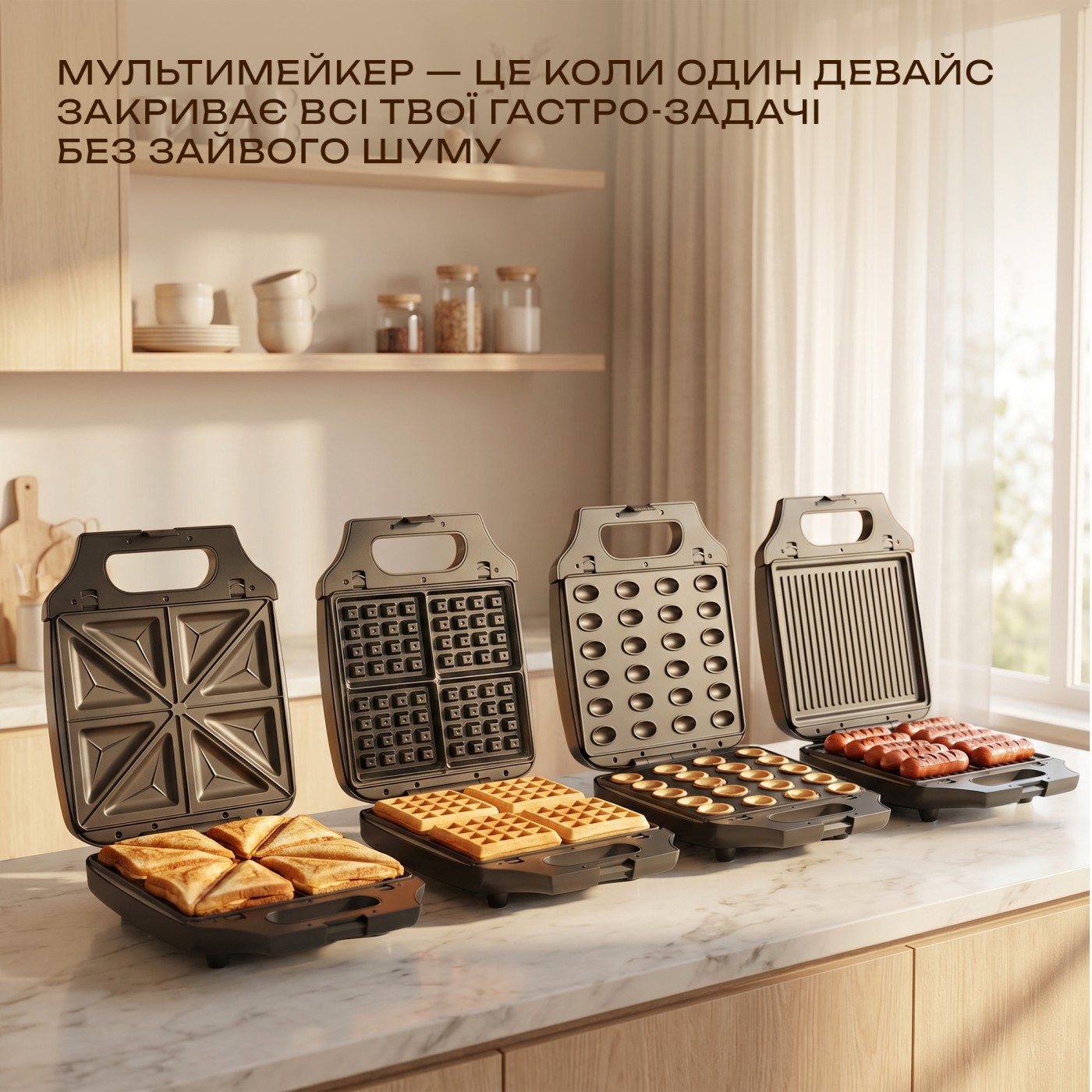 Потужність: 1400 Вт; 4 в 1; Пластина: гриль, бельгійські вафлі (4 шт.), трикутні сендвічі (8 шт.), горішниця (24 шт.); Індикатор живлення і готовності їжі; Автоконтроль температури; Покриття пластин: антипригарне; Розмір робочої поверхні: 25,4х21,5 см; Матеріал корпусу: бакеліт+нержавіюча сталь; Розмір виробу: 31,9х11х26,1 см; Колір: чорний+нерж.