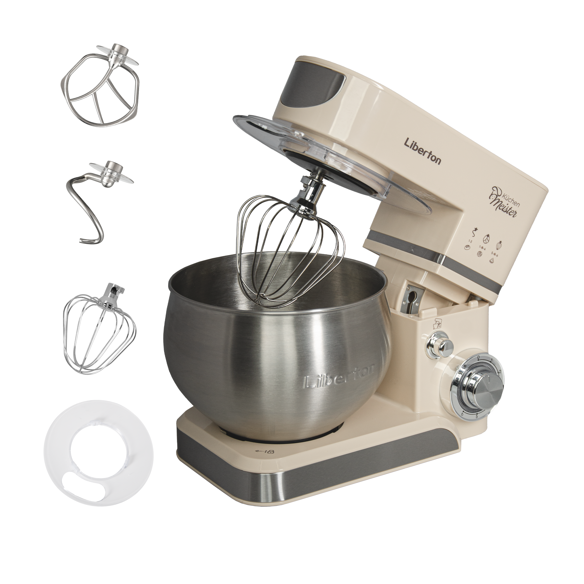 Потужність: 1800 Вт; Кіл-ть швидкостей: 6; Режим "Пульс": так; Насадки: гак для тіста, плоский збивач, вінчик, лопатка з пластику; Матеріал насадок: нержавіюча сталь; Кнопка вилучення насадок: так; Матеріал корпусу: пластик; Матеріал чаші: нержавіюча сталь; Об'єм чаші: 5 л; Розмір виробу: 37х28х22,5 см; Колір: кремовий.