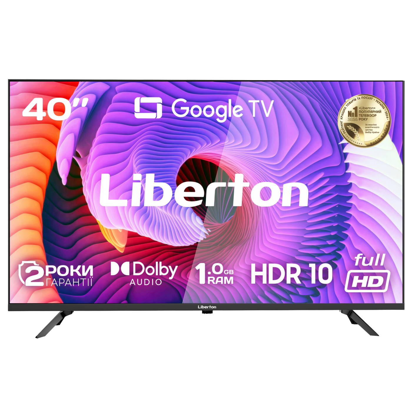Screen size: 40" (100 cm); Design: frameless; Resolution: 1920x1080 pixels (FULL HD); Operating system: GOOGLE TV; Version: 5.0 (OFFICIAL); Technologies: HDR 10, Dolby Audio, Dolby Digital Plus; RAM: 1 GB; Internal storage: 8 GB; Tuner: DVB-T/C/T2; Viewing angle: 178°; Refresh rate: 60 Hz; Inputs: RF antenna, Ethernet (RJ45), USB, HDMI, composite A/V; Outputs: headphone jack, optical; Sound output: 16 W; Plastic center stand; VESA mount: 200x200 mm; Voice remote control; Color: Black.