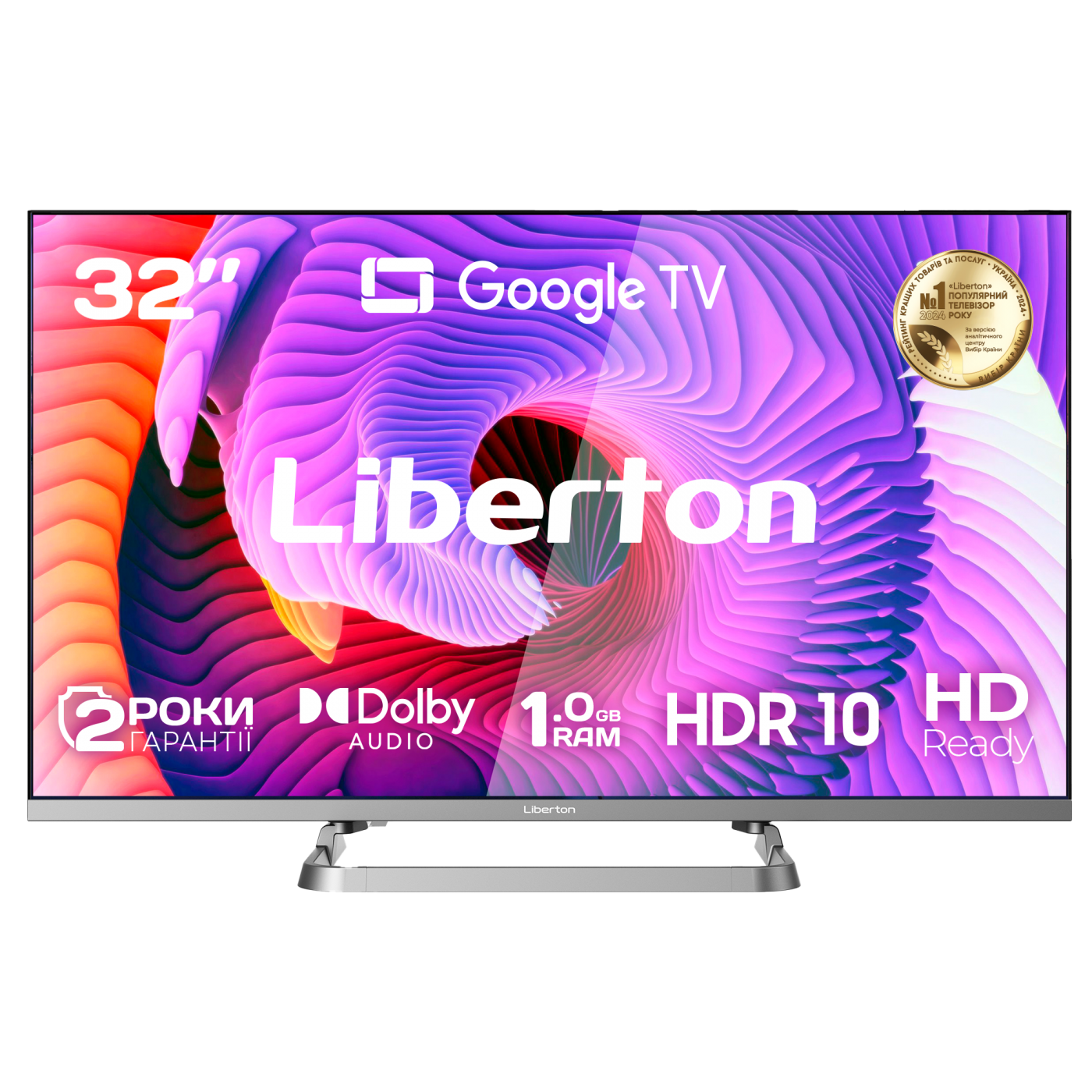 Діагональ: 32" (81 см); Корпус: безрамковий; Роздільна здатність: 1366х768 пікс. (HD ready); Операційна система: GOOGLE TV; Версія: 5.0 (ОФІЦІЙНА); Технології: HDR 10, Dolby Audio, Dolby Digital Plus; Оперативна пам'ять: 1 Гб; Внутрішня пам'ять: 8 Гб; Тюнер: DVB-T/C/T2; Кут огляду : 178 град.; Частота: 60 Гц; Входи: антенний (RF), Ethernet (RJ45), USB, HDMI, композитний A/V; Виходи: навушники, оптичний; Потужність звуку: 16 Вт; Центральна ніжка; Кріплення VESA: 200х200 мм; Голосовий пульт; колір: сірий.