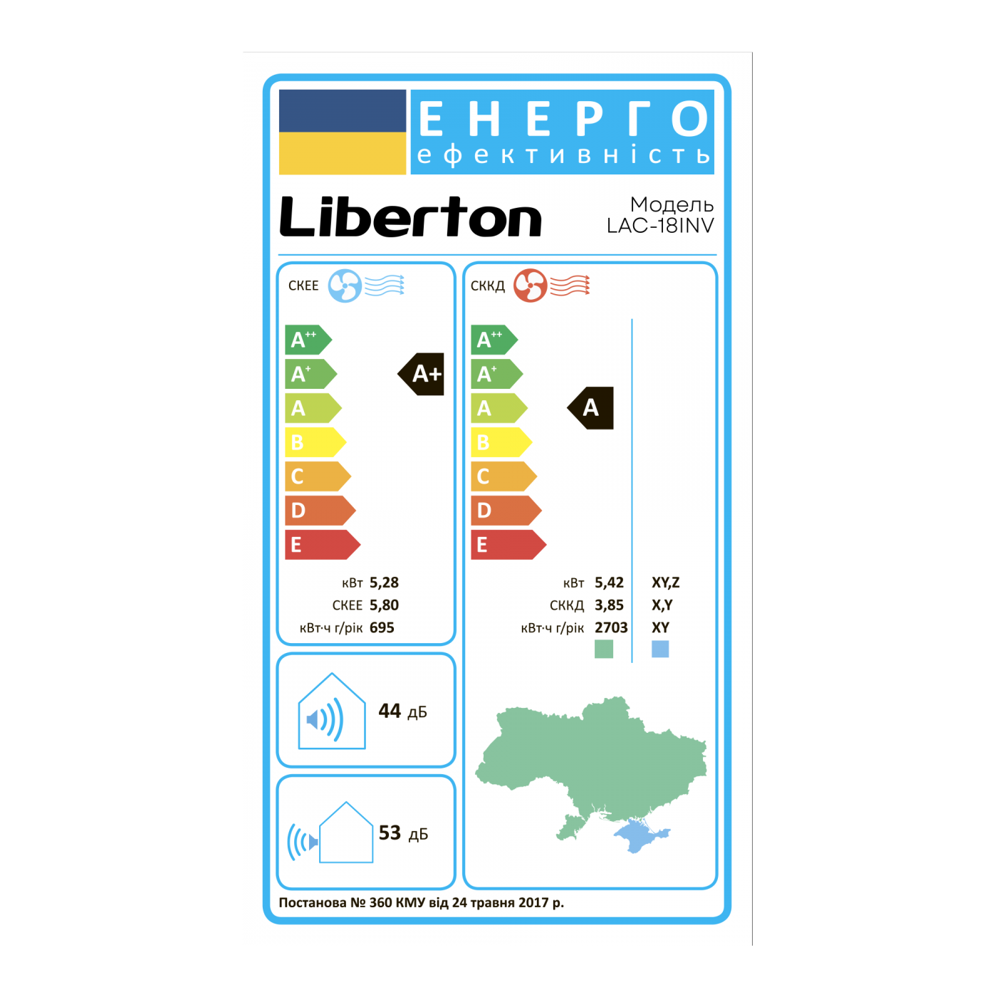 Type: split system; Compressor type: inverter; Cooling/heating area: 60 m2; Cooling/heating capacity: 5280/5420 W; Power consumption: 1645/1500 W; Modes: auto, sleep, eco, air dehumidification, ventilation; Timer: 24 h; Hidden display; Antibacterial filter; Refrigerant: R32; Color: white.