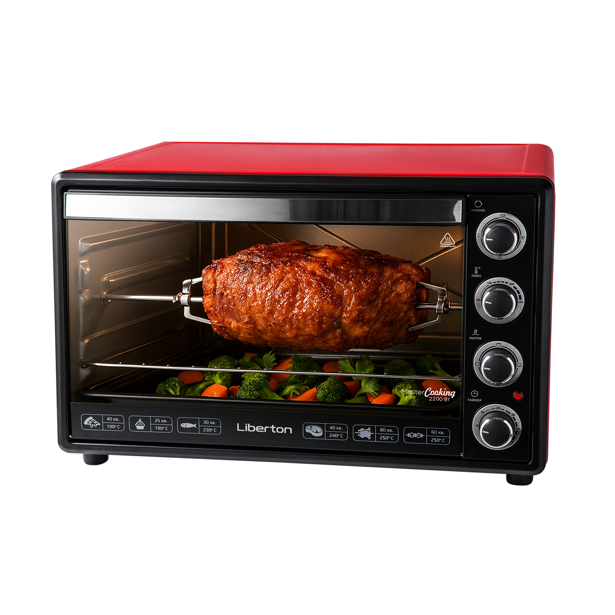 Об'єм: 65 л; Висота внутрішньої камери: 32,5 см; Потужність: 2200 Вт; Термостат: 250 град.; Комплектація: решітка, прямокутне деко, кругле деко для піци, тримач для дека, рожен; Скло в дверцятах: 1; Режими приготування: 3; Конвекція; Підсвітка; Управління: механічне; Внутрішнє покриття: цинкове; Розмір виробу: 58,3x49,2x39,7 см; Колір: червоний+чорний.