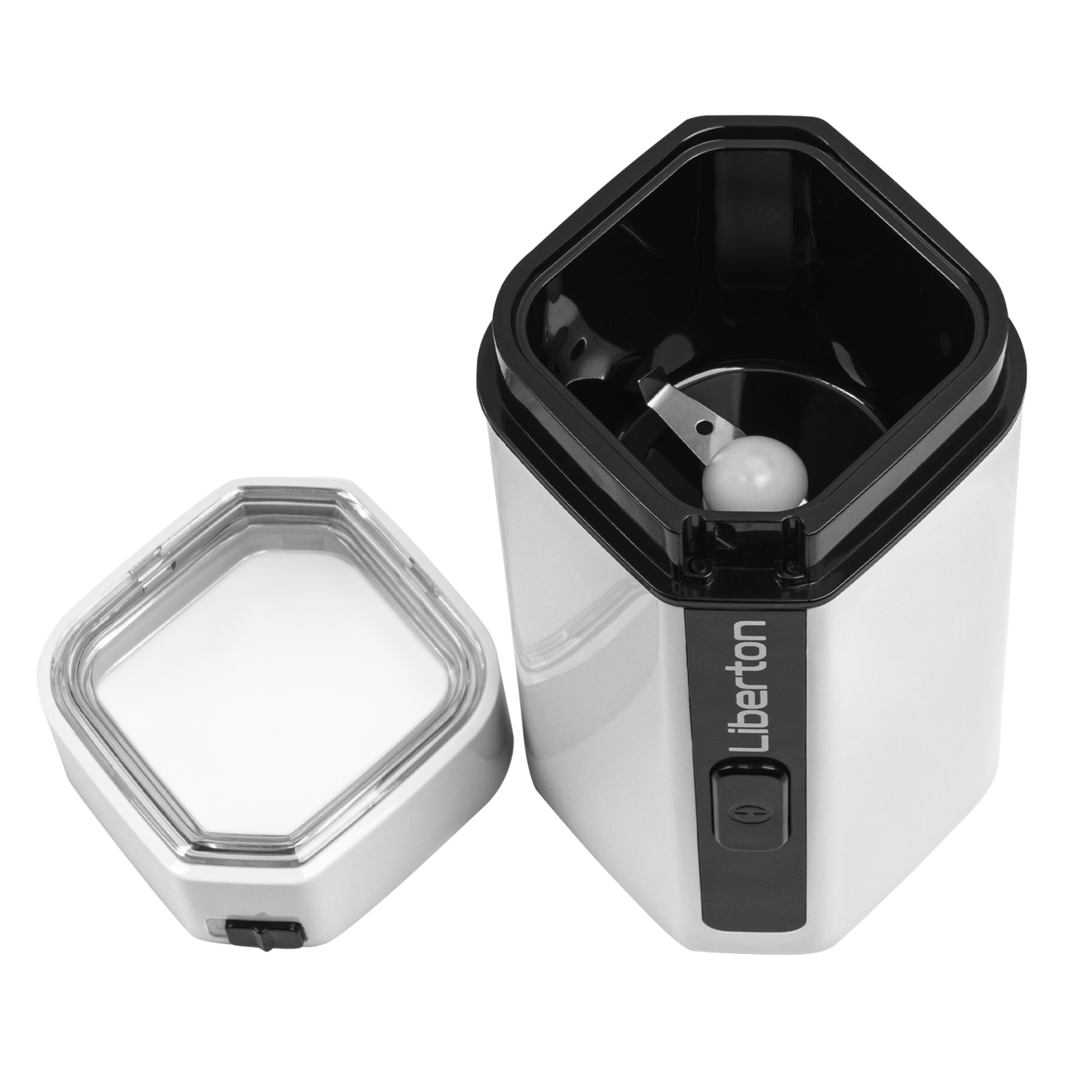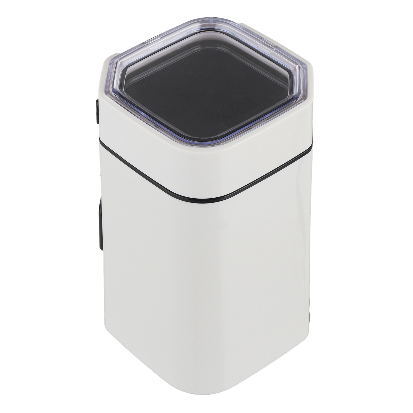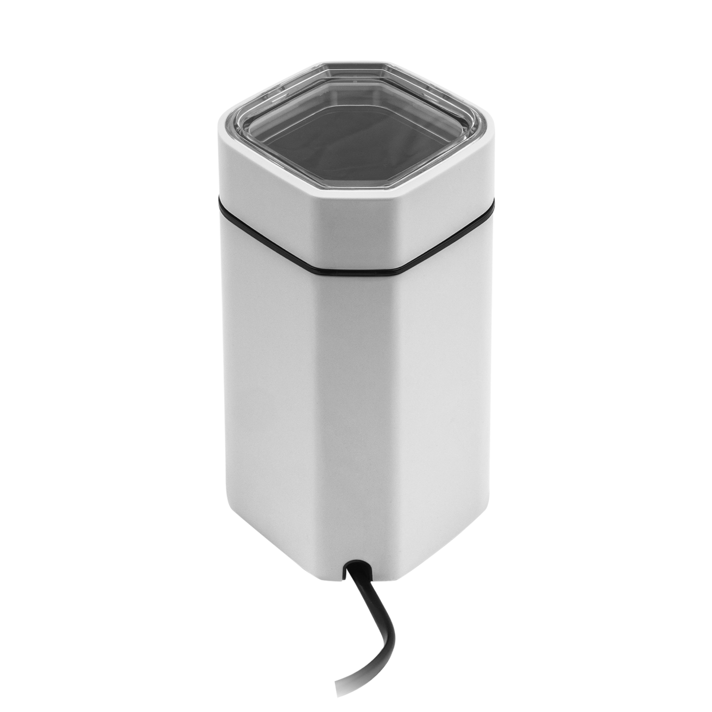 Power: 150 W; Capacity of the bean container: 50 g; Pulse mode; Container material: plastic; Stainless steel impact knife; Cord storage compartment; Lock-on function when the lid is removed; Product size: 8.7x17.3x9.9 cm; Body material: plastic; Color: white.