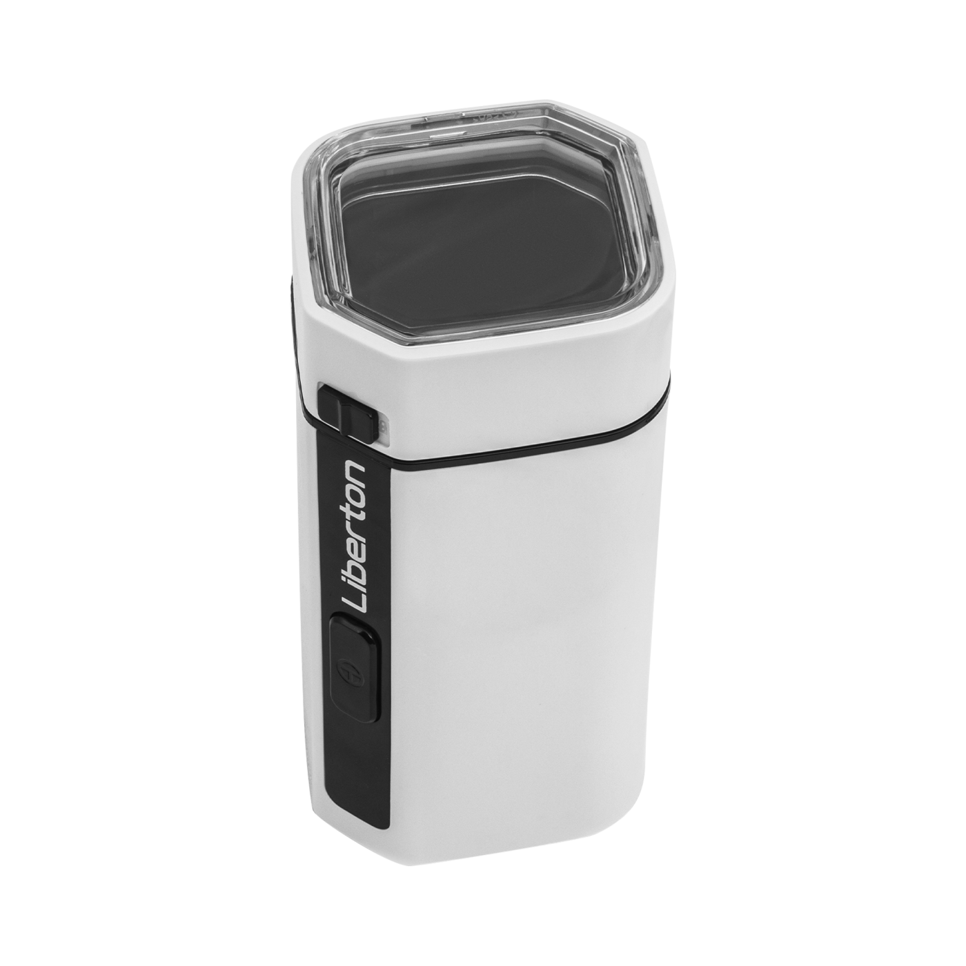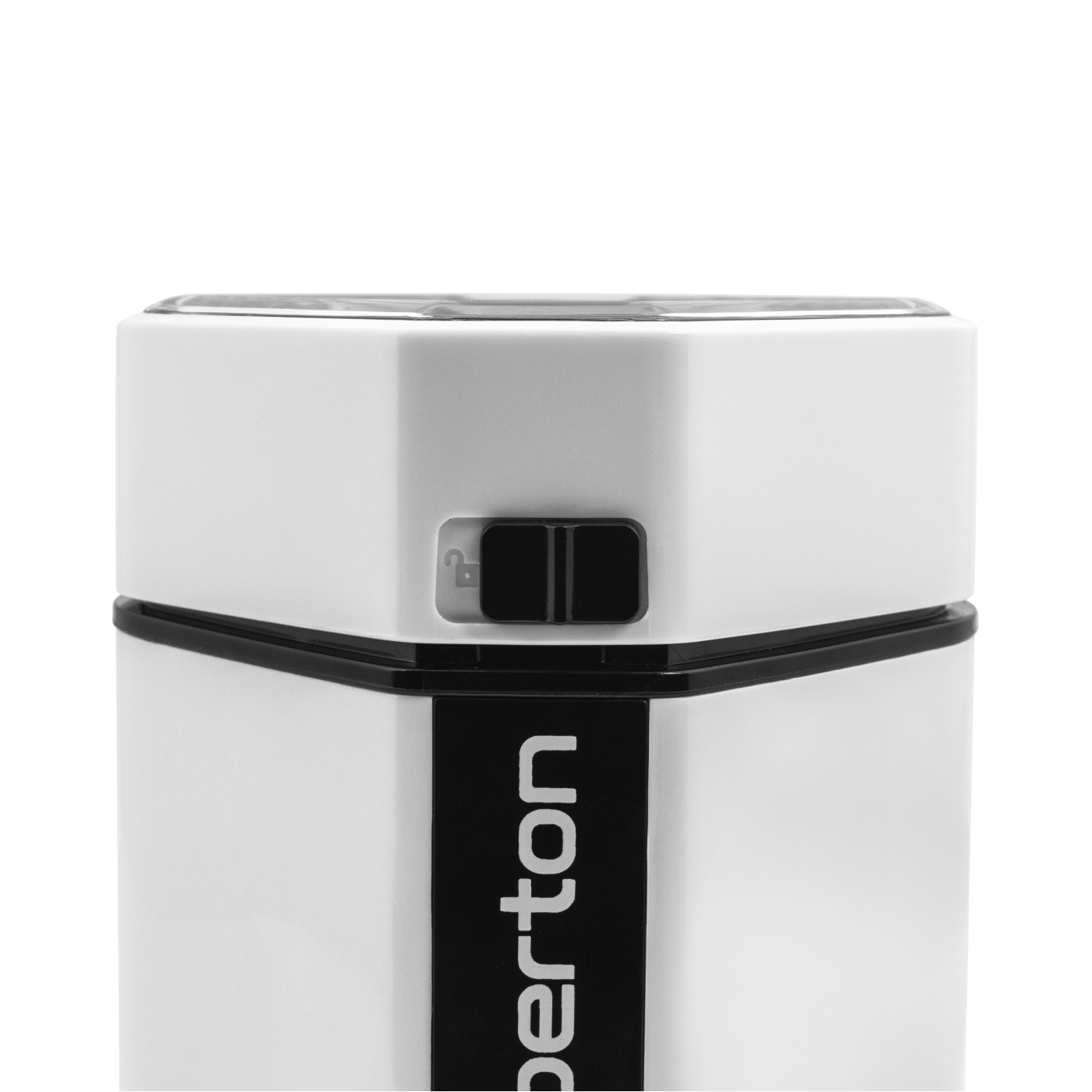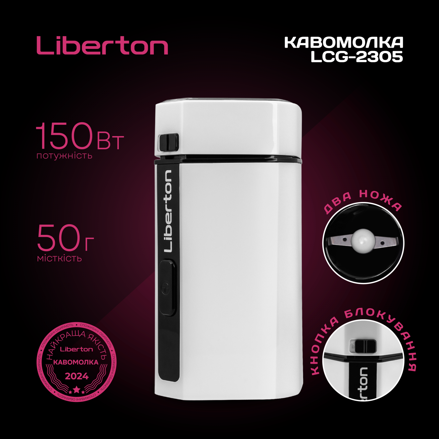 Power: 150 W; Capacity of the bean container: 50 g; Pulse mode; Container material: plastic; Stainless steel impact knife; Cord storage compartment; Lock-on function when the lid is removed; Product size: 8.7x17.3x9.9 cm; Body material: plastic; Color: white.