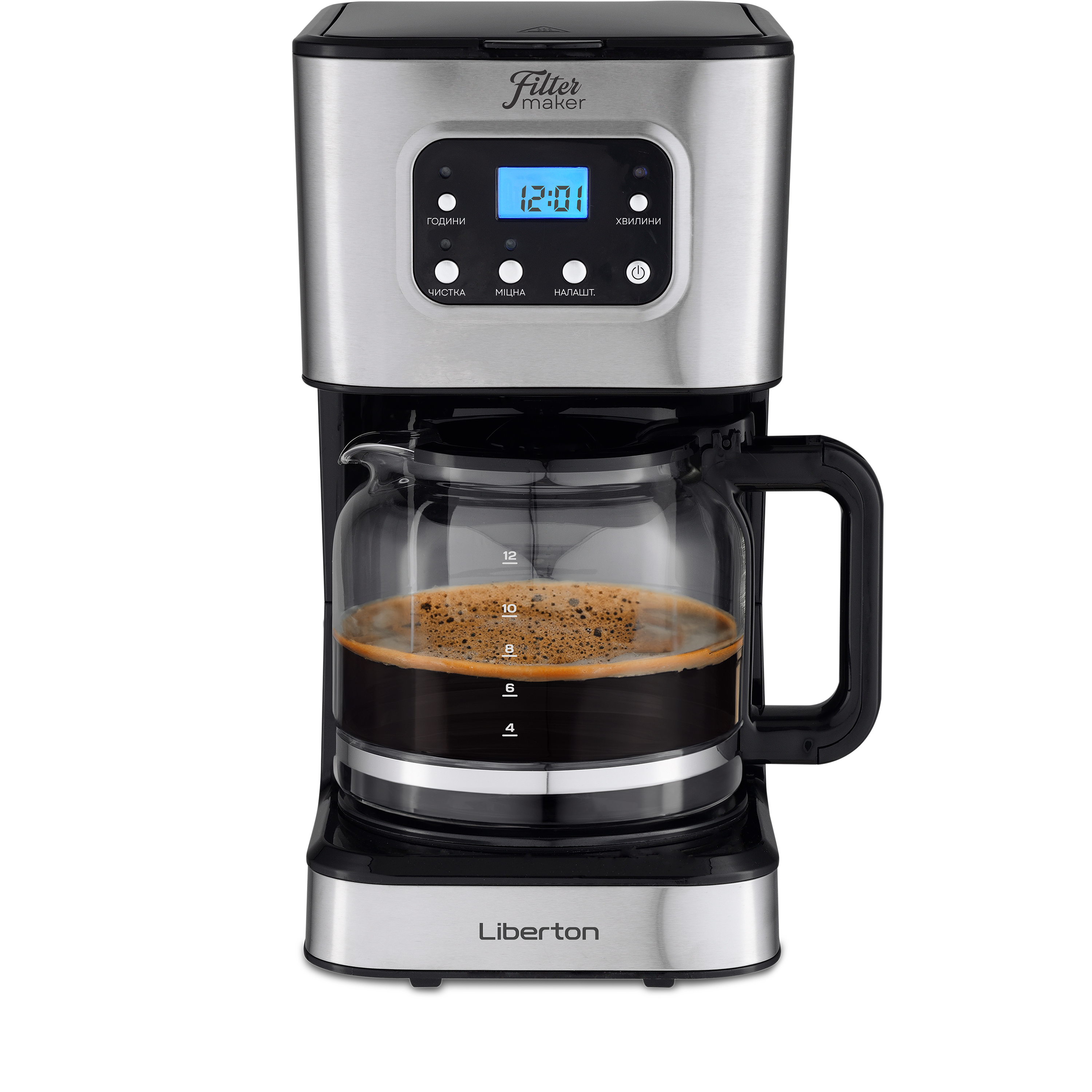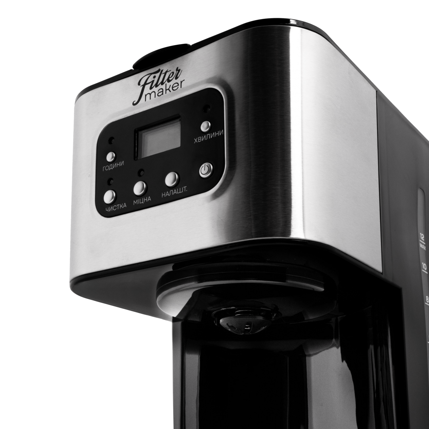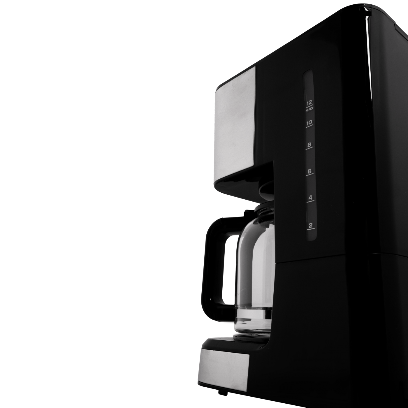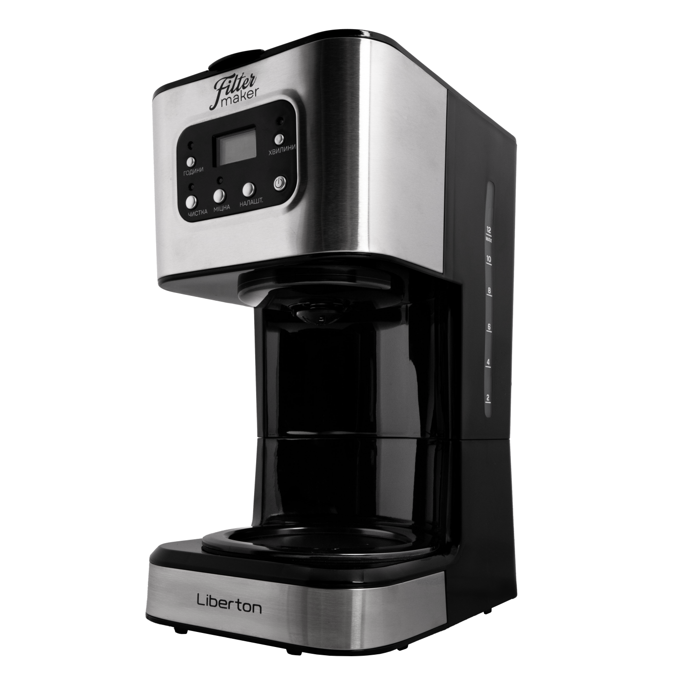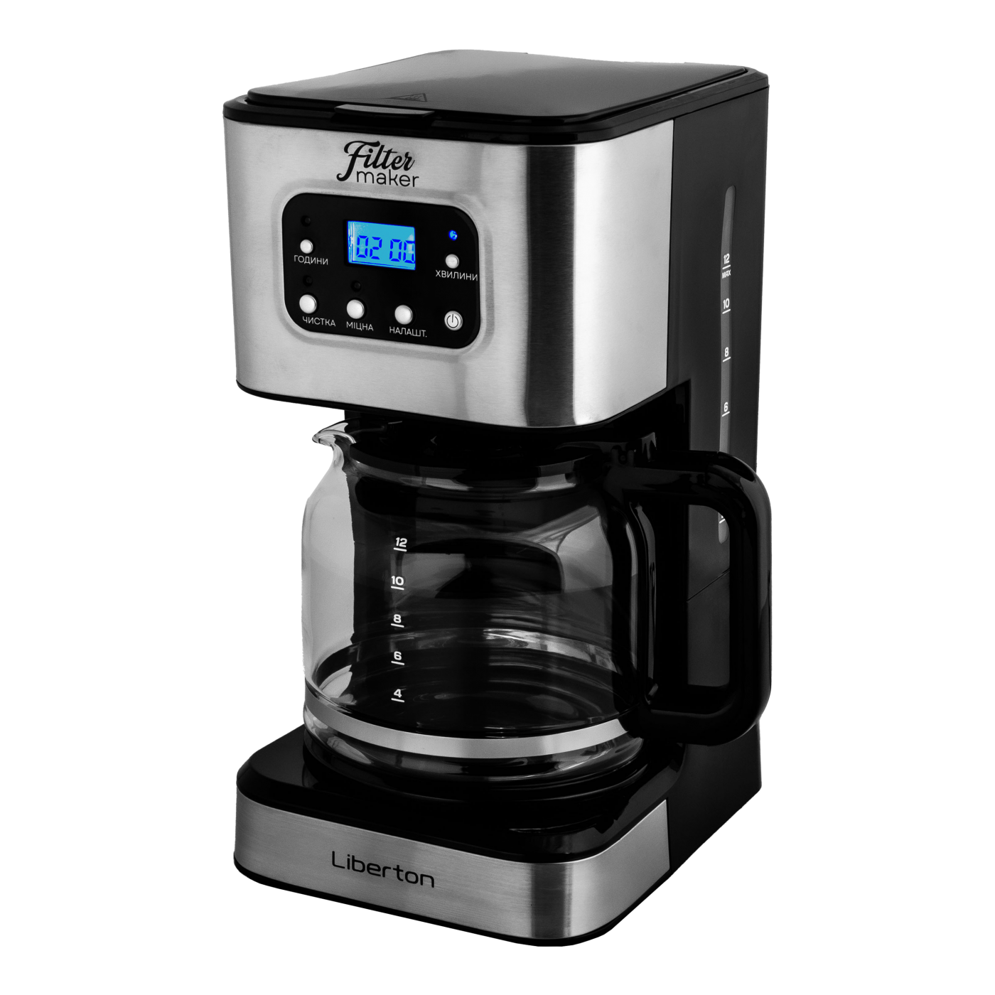 Type of coffee maker: drip; Power: 950 W; Control type: electronic; Water tank capacity: 1.5 l; Number of cups of the finished drink: 12 pcs.; Type of coffee: ground; Filter type: reusable; Features: coffee strength adjustment, automatic temperature maintenance, coffee pot heating, automatic shutdown, cleaning program, anti-drip system, display, clock, timer (24 hours), overheating protection, power on indicator, water level indicator, measuring spoon; Case material: plastic + stainless steel; Material of the coffee pot: high-temperature glass; Product size: 16,8х32,3х23 cm; Color: black+silver.