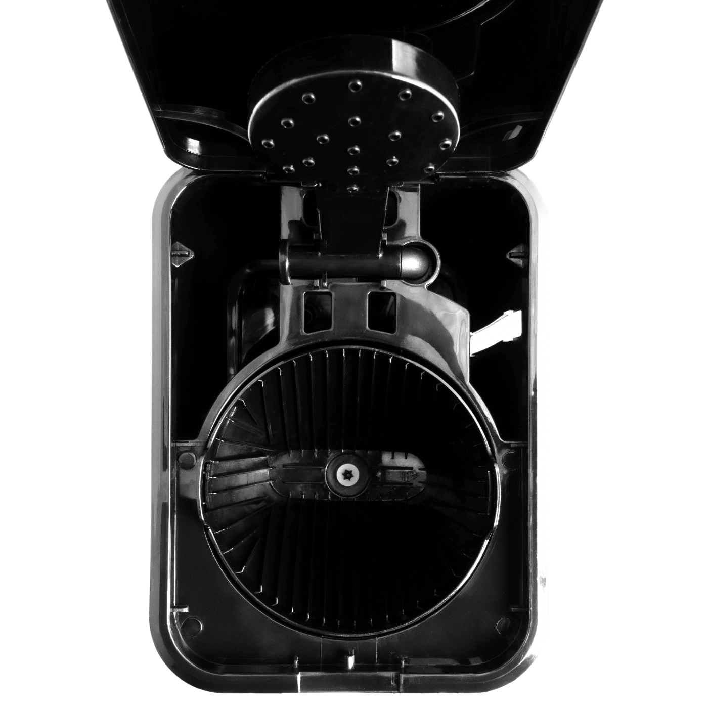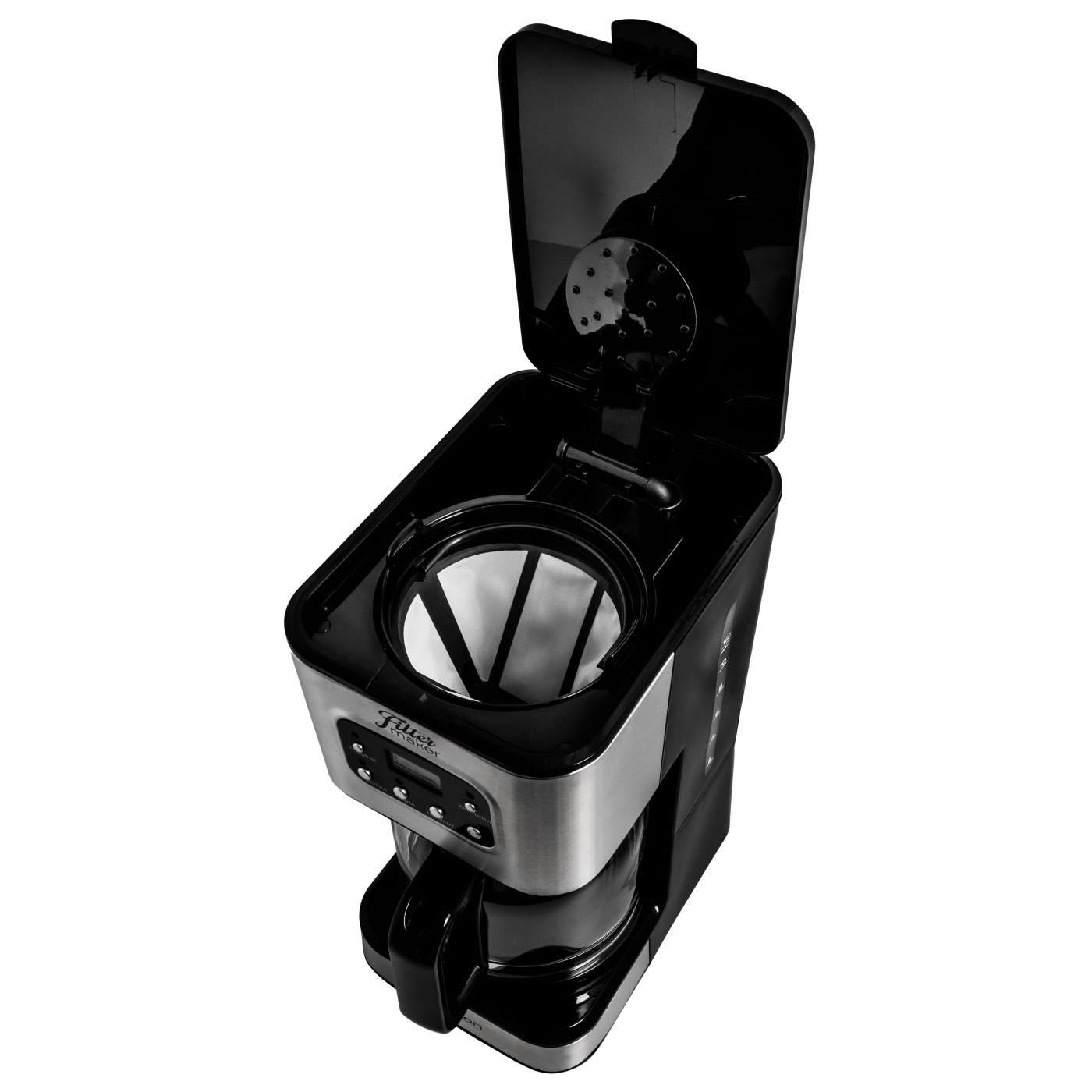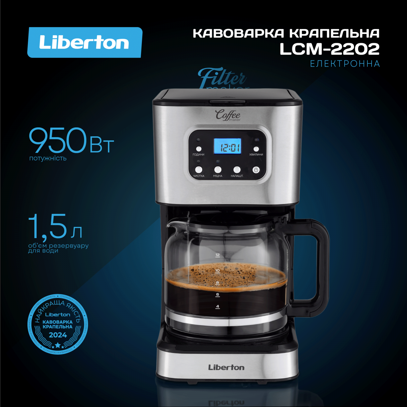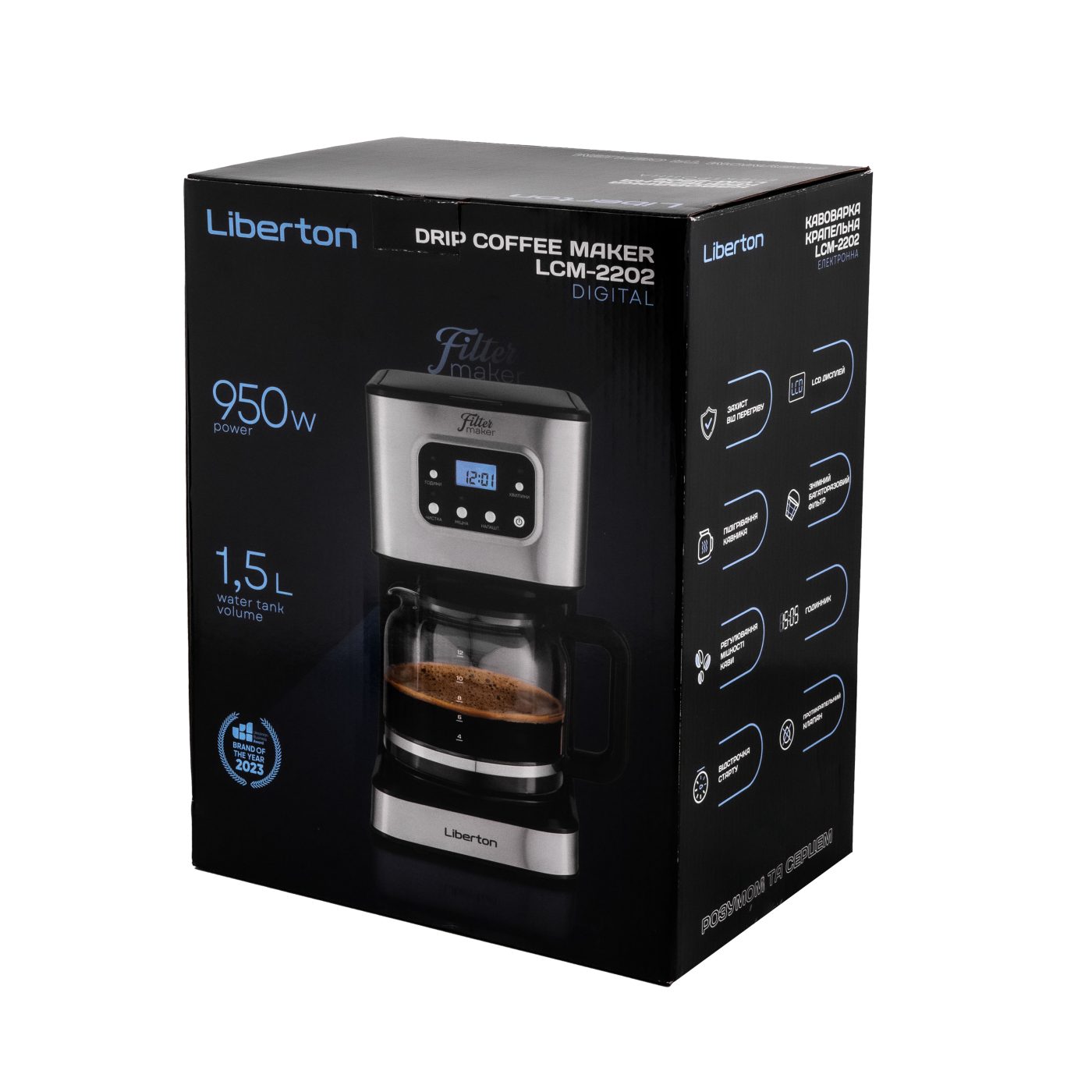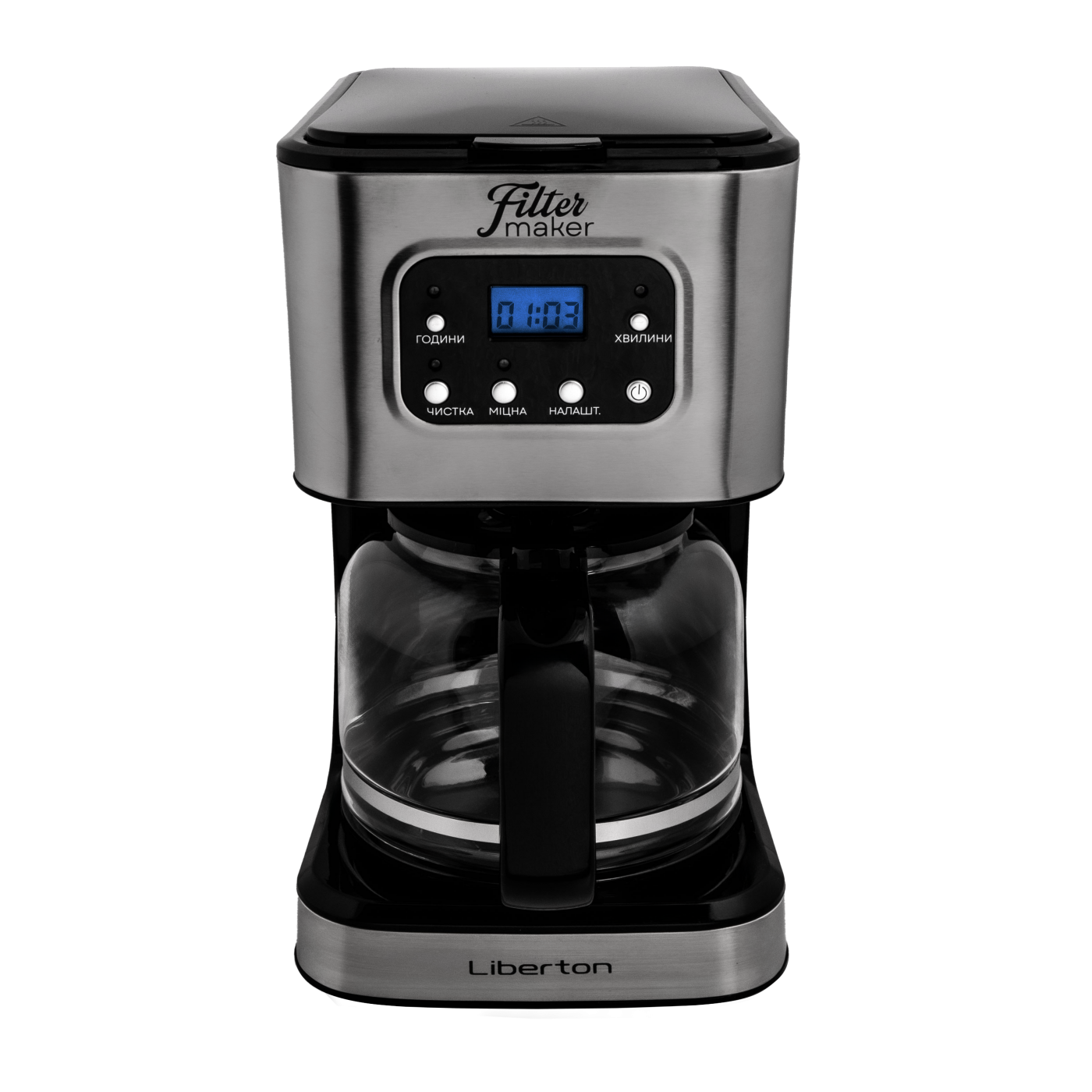 Type of coffee maker: drip; Power: 950 W; Control type: electronic; Water tank capacity: 1.5 l; Number of cups of the finished drink: 12 pcs.; Type of coffee: ground; Filter type: reusable; Features: coffee strength adjustment, automatic temperature maintenance, coffee pot heating, automatic shutdown, cleaning program, anti-drip system, display, clock, timer (24 hours), overheating protection, power on indicator, water level indicator, measuring spoon; Case material: plastic + stainless steel; Material of the coffee pot: high-temperature glass; Product size: 16,8х32,3х23 cm; Color: black+silver.