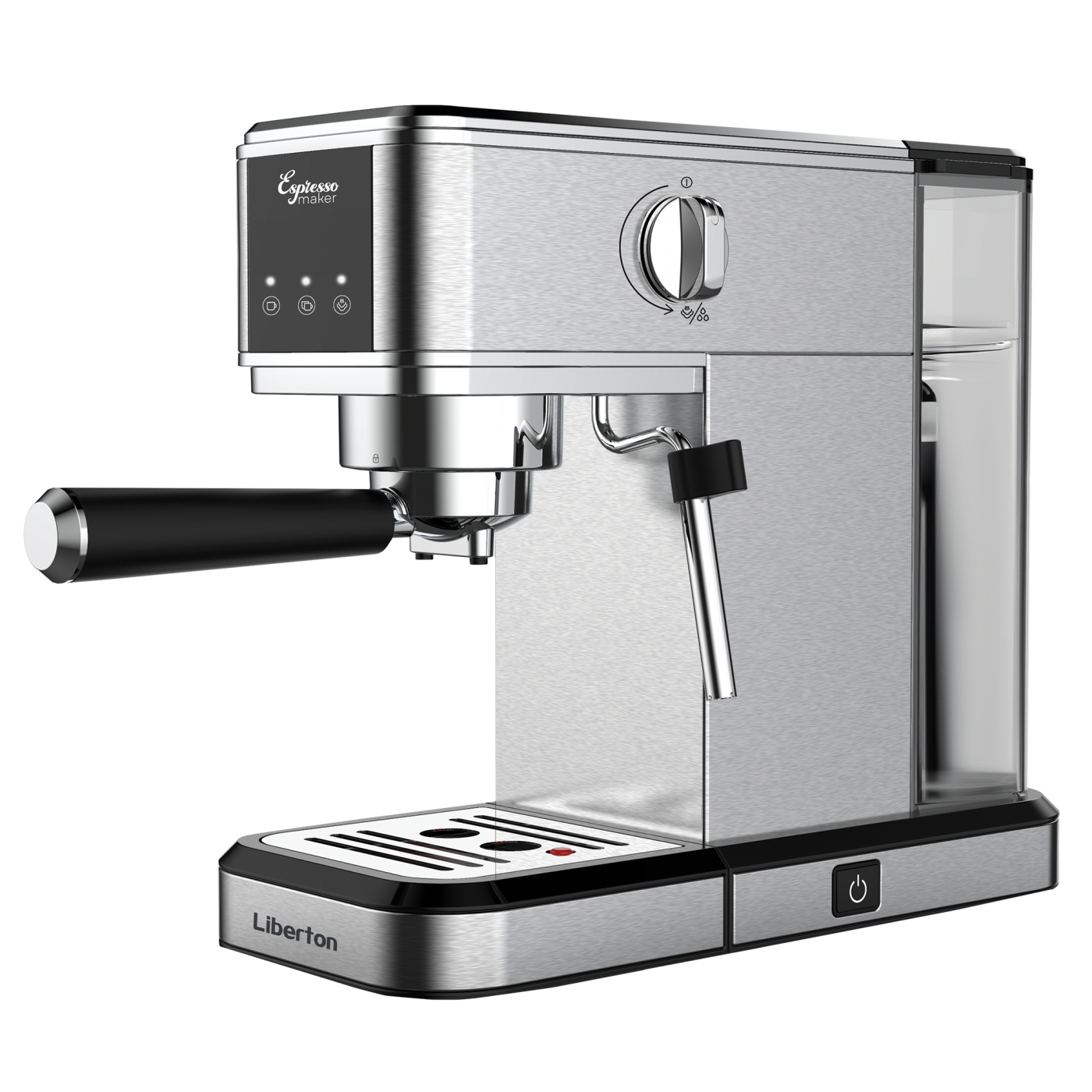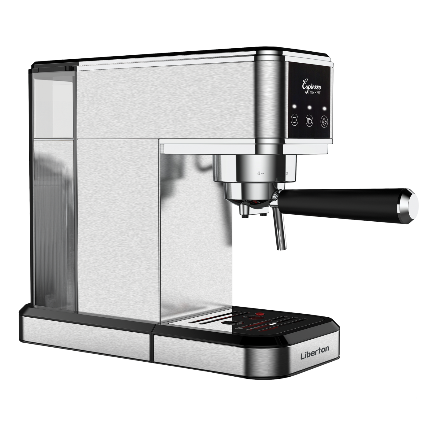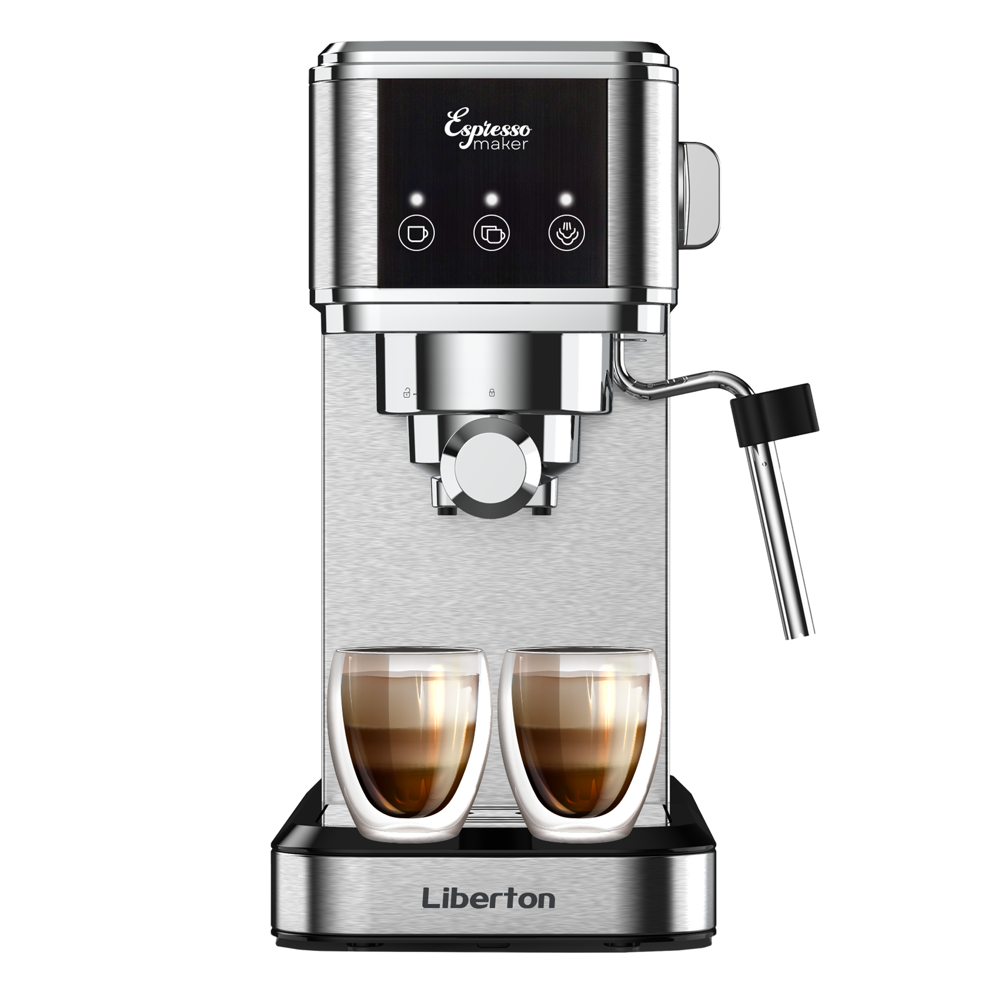 Power: 1350 W; Pressure: 15 bar; Control type: touch; Water tank capacity: 1.0 L; Coffee type: ground coffee; Features: Panarello steam wand, manual milk frother, hot water dispenser, dual cup brewing, cup or carafe warming, removable drip tray, overheating protection, overpressure protection, power indicator, water level indicator, measuring spoon/tamper; Body material: stainless steel; Product dimensions (cm): 14.7 x 32.3 x 29.5; Color: black + silver.