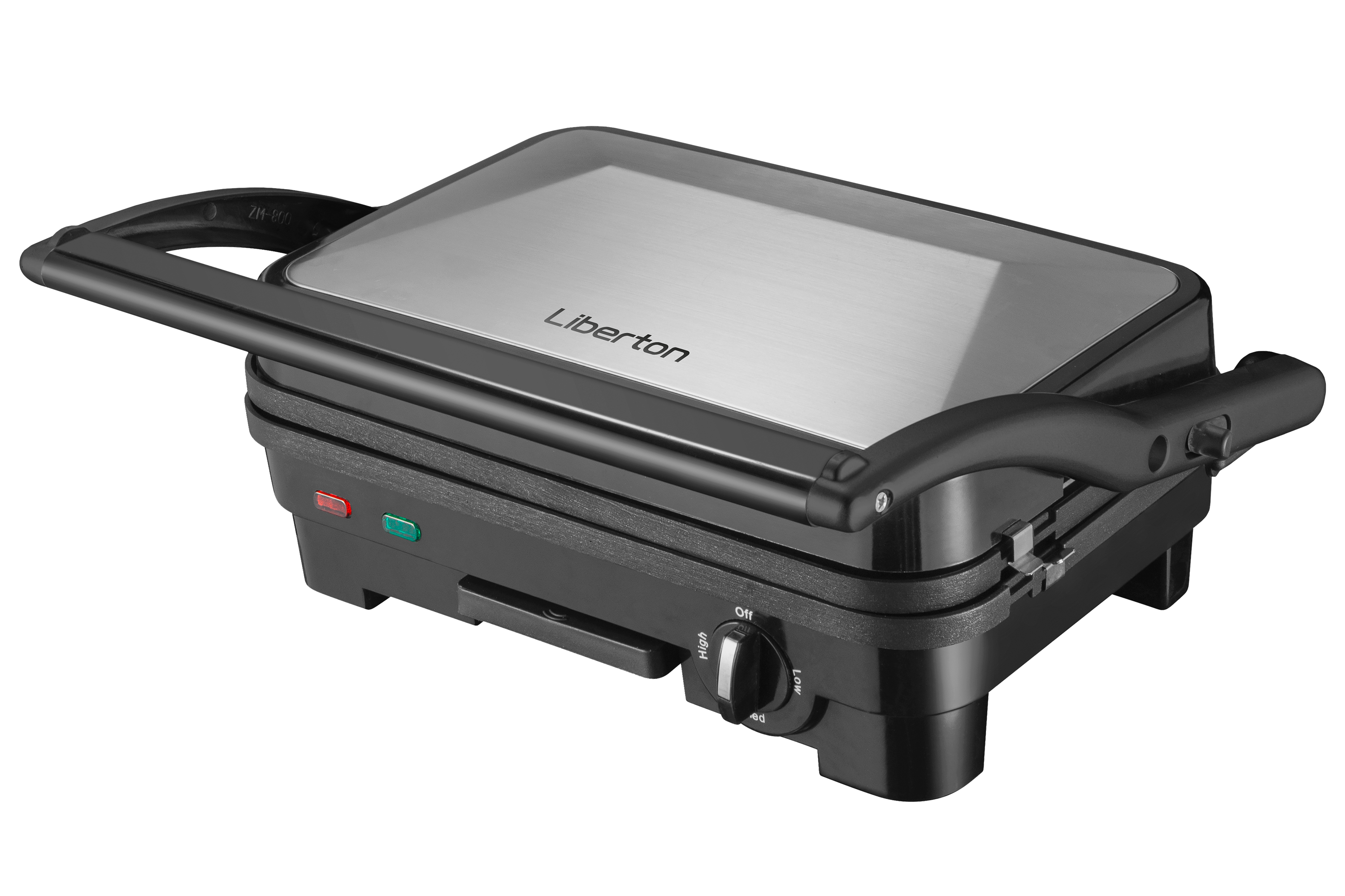 Power: 1800 W; Type: contact; Working surface size: 29x18.8 cm; Removable double-sided plate (grill/flat); Power indicator; Food readiness indicator; Temperature regulator; Locking system; Thermally insulated handle; Accessories: cleaning scraper, grease tray; Plate coating: non-stick; Opening: 180 degrees; Case material: bakelite+stainless steel; Product size: 33.2x28.3x14.2 cm; Color: black+stainless