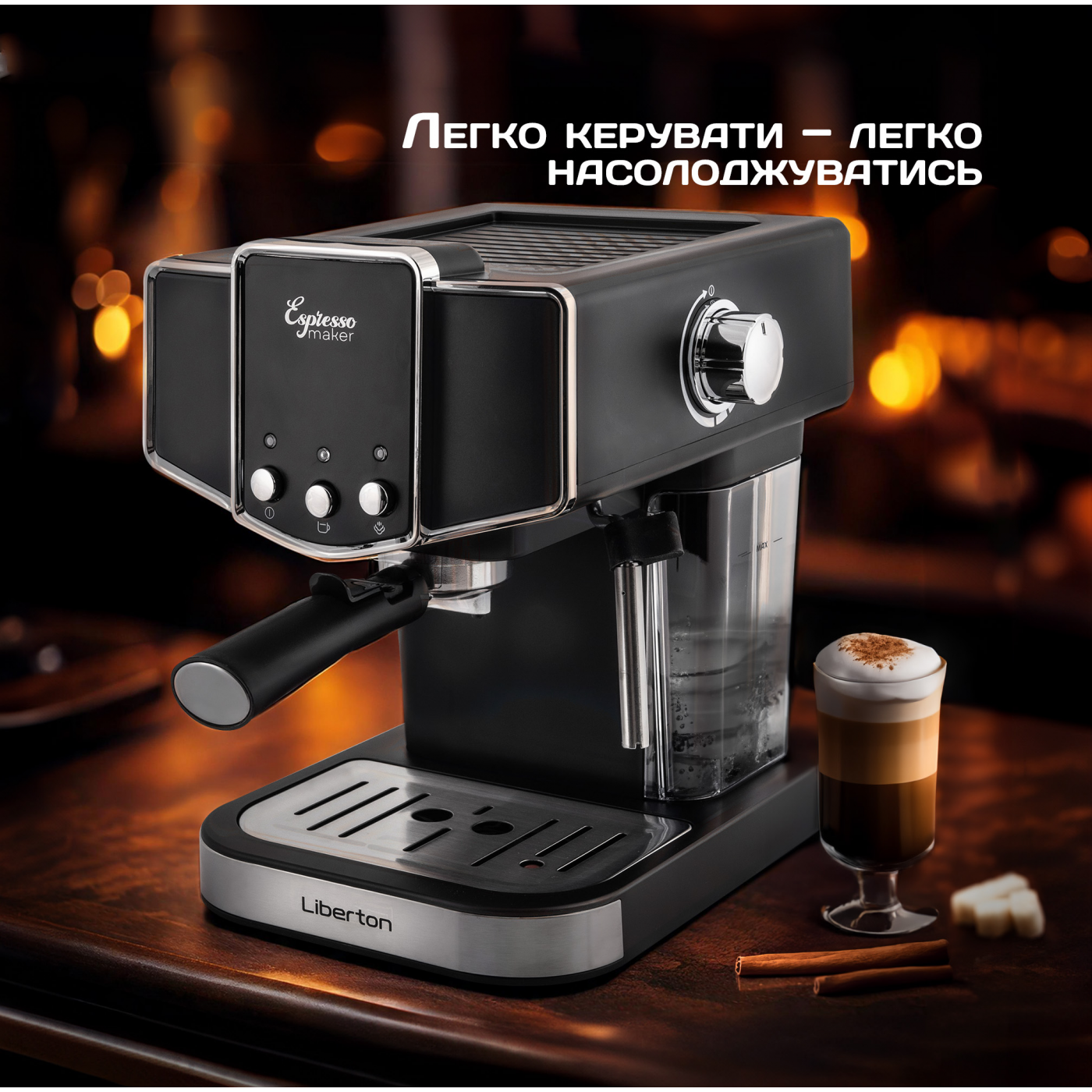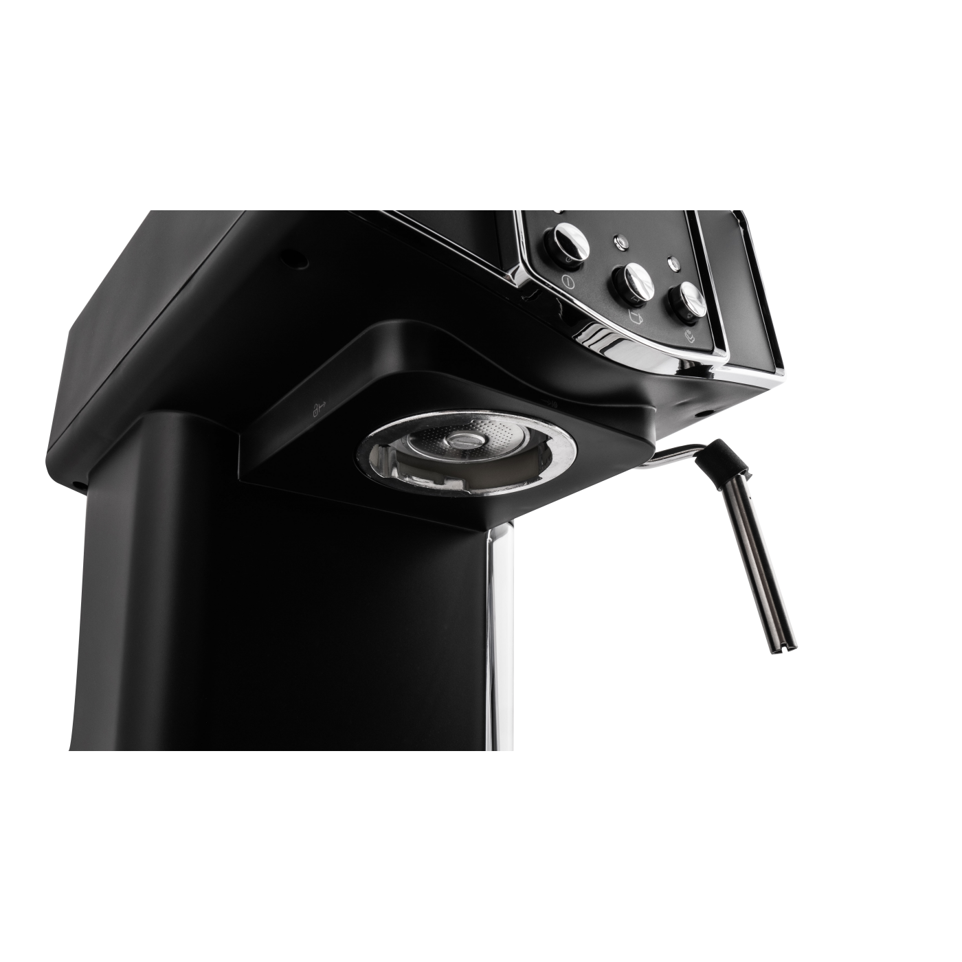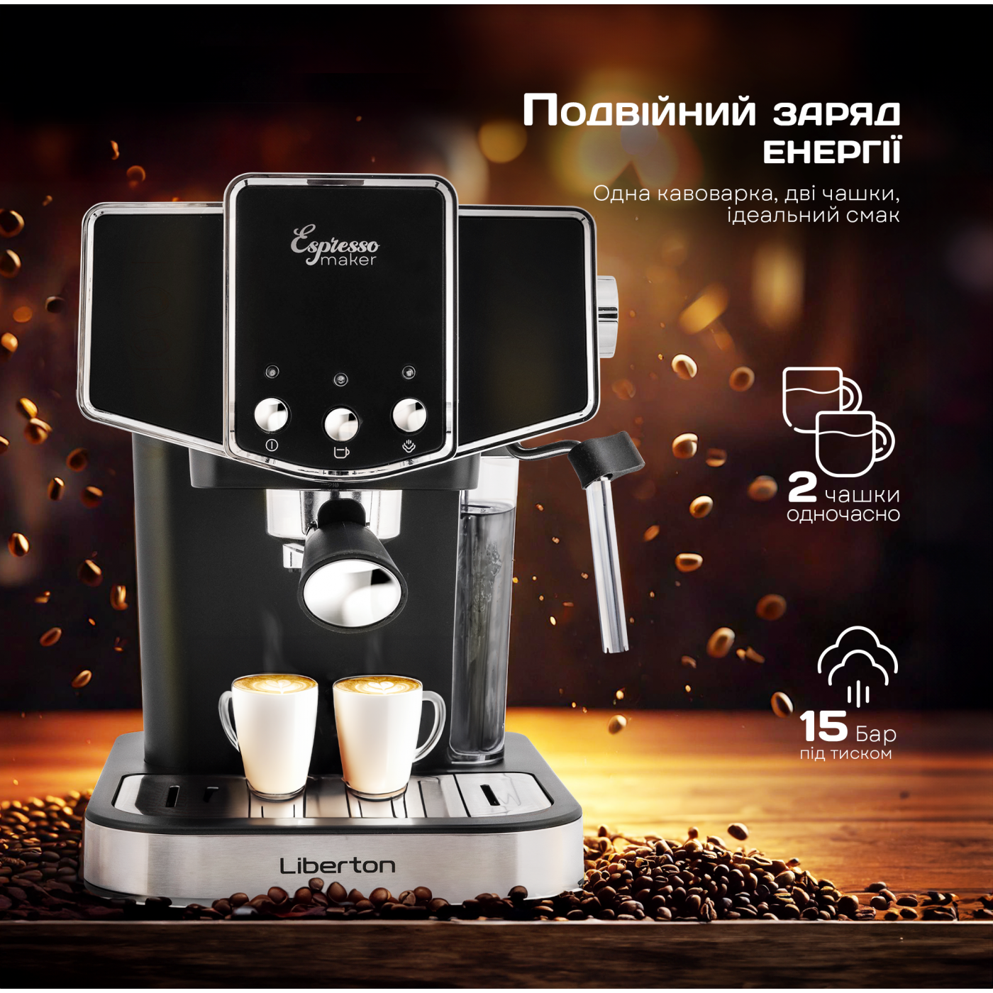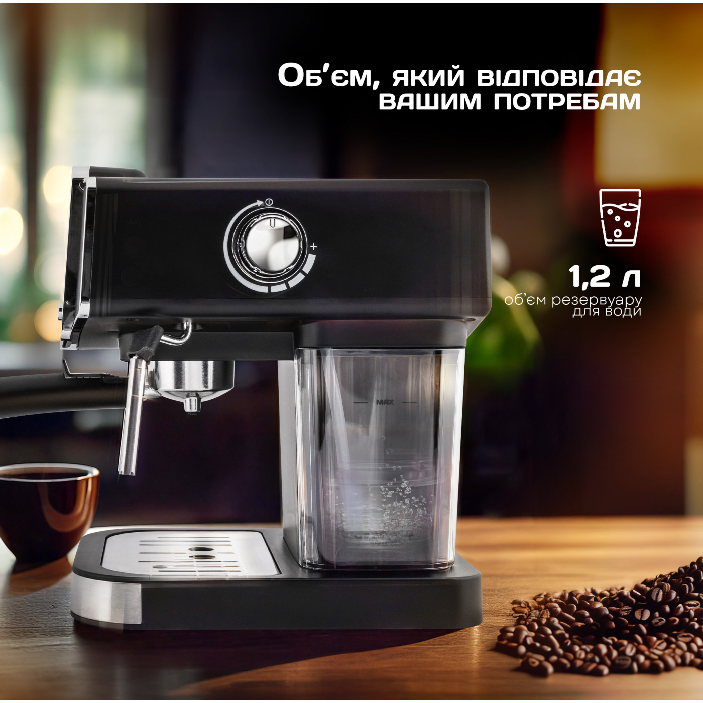 Coffee maker type: horn (espresso); Type: semi-automatic; Power: 950 W; Pressure: 15 bar; Control type: mechanical; Water tank capacity: 1.2 l; Coffee type: ground; Features: pannarello nozzle, manual cappuccino maker, adjustable steam, hot water, simultaneous preparation of two cups of coffee, removable drip tray, coffee pot heating, overheating protection, overpressure protection, power-on indicator, water level indicator, measuring spoon-tamper; Body material: plastic + stainless steel; Product size: 23,1х29,3х27,6 cm; Color: black + silver.