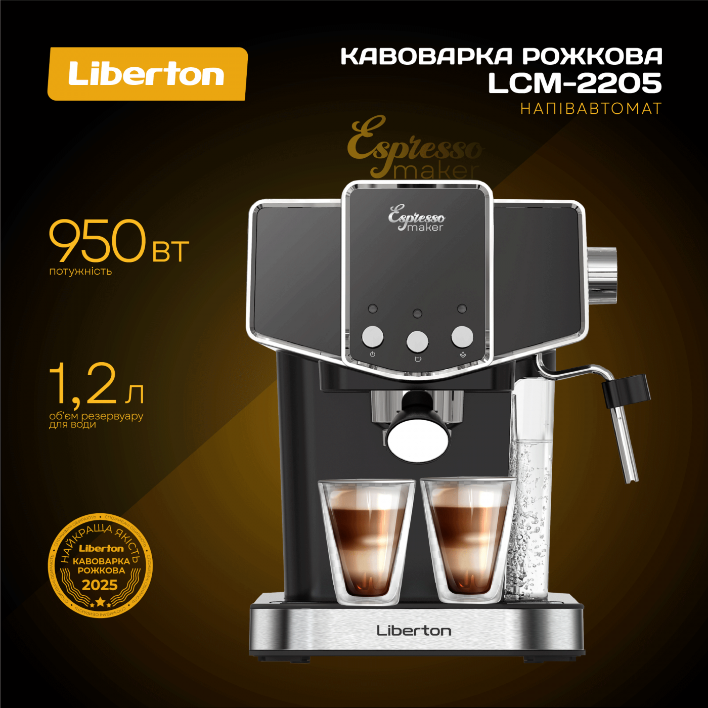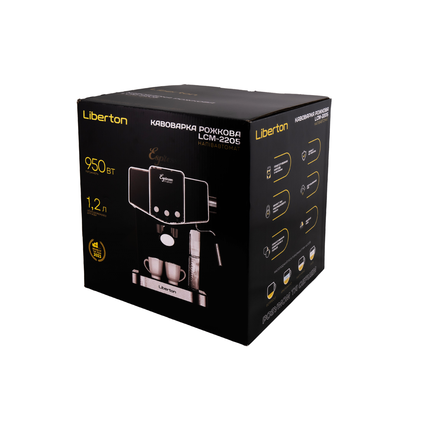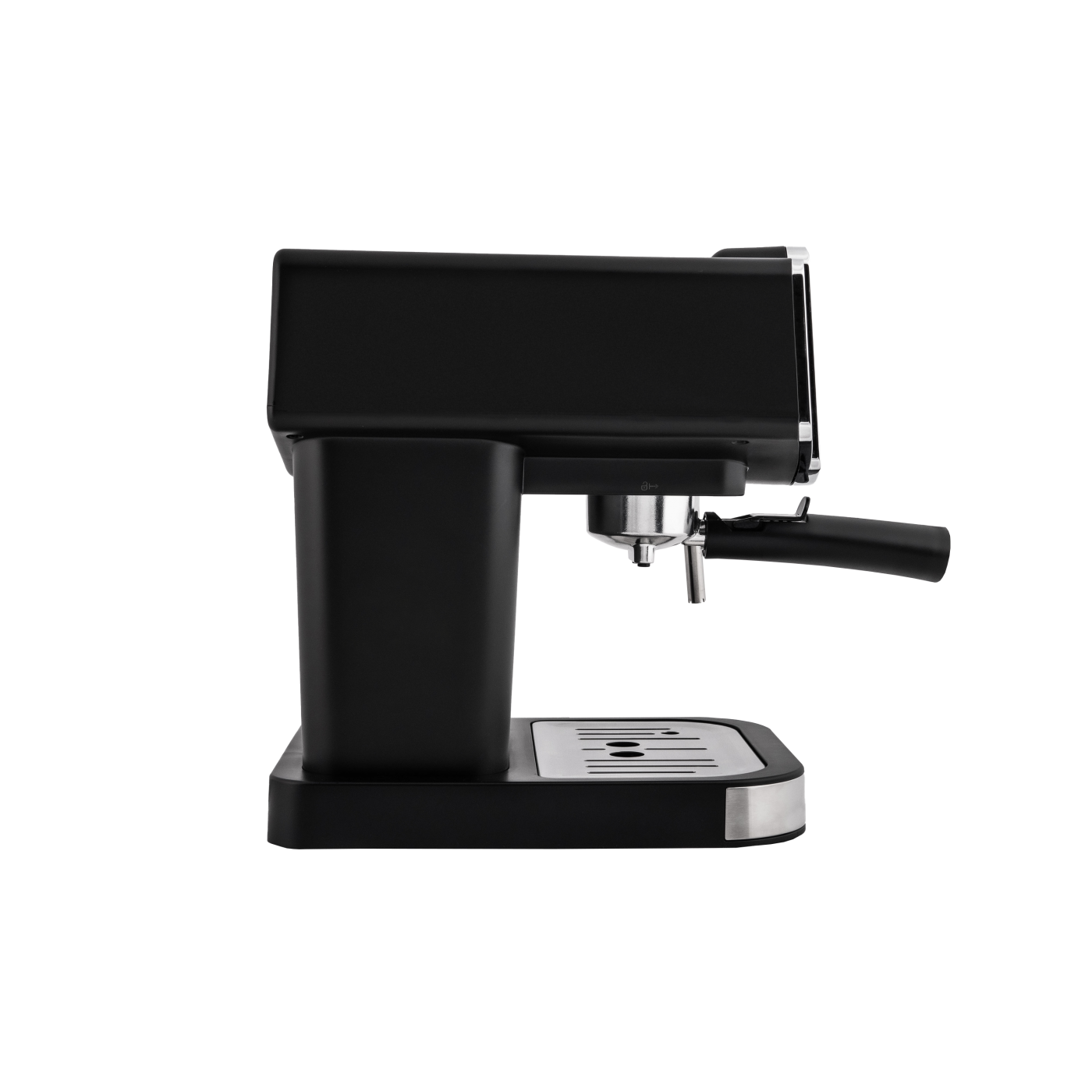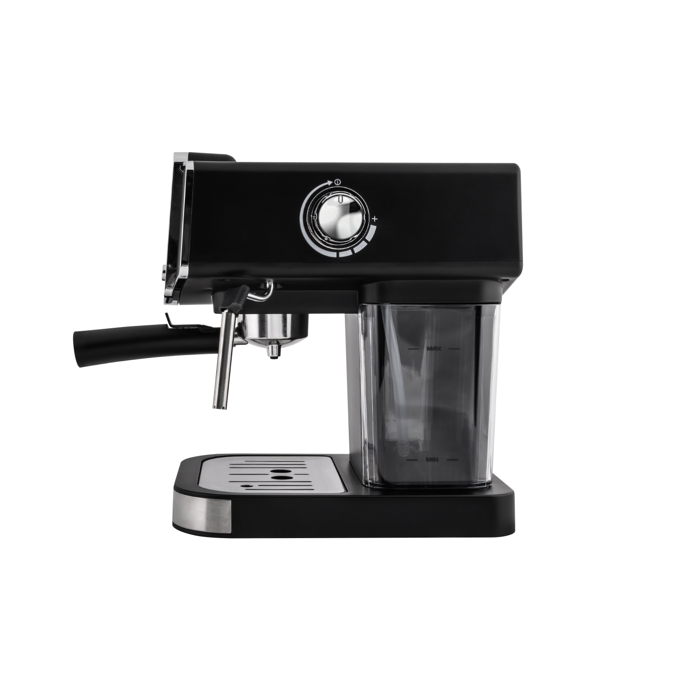 Coffee maker type: horn (espresso); Type: semi-automatic; Power: 950 W; Pressure: 15 bar; Control type: mechanical; Water tank capacity: 1.2 l; Coffee type: ground; Features: pannarello nozzle, manual cappuccino maker, adjustable steam, hot water, simultaneous preparation of two cups of coffee, removable drip tray, coffee pot heating, overheating protection, overpressure protection, power-on indicator, water level indicator, measuring spoon-tamper; Body material: plastic + stainless steel; Product size: 23,1х29,3х27,6 cm; Color: black + silver.