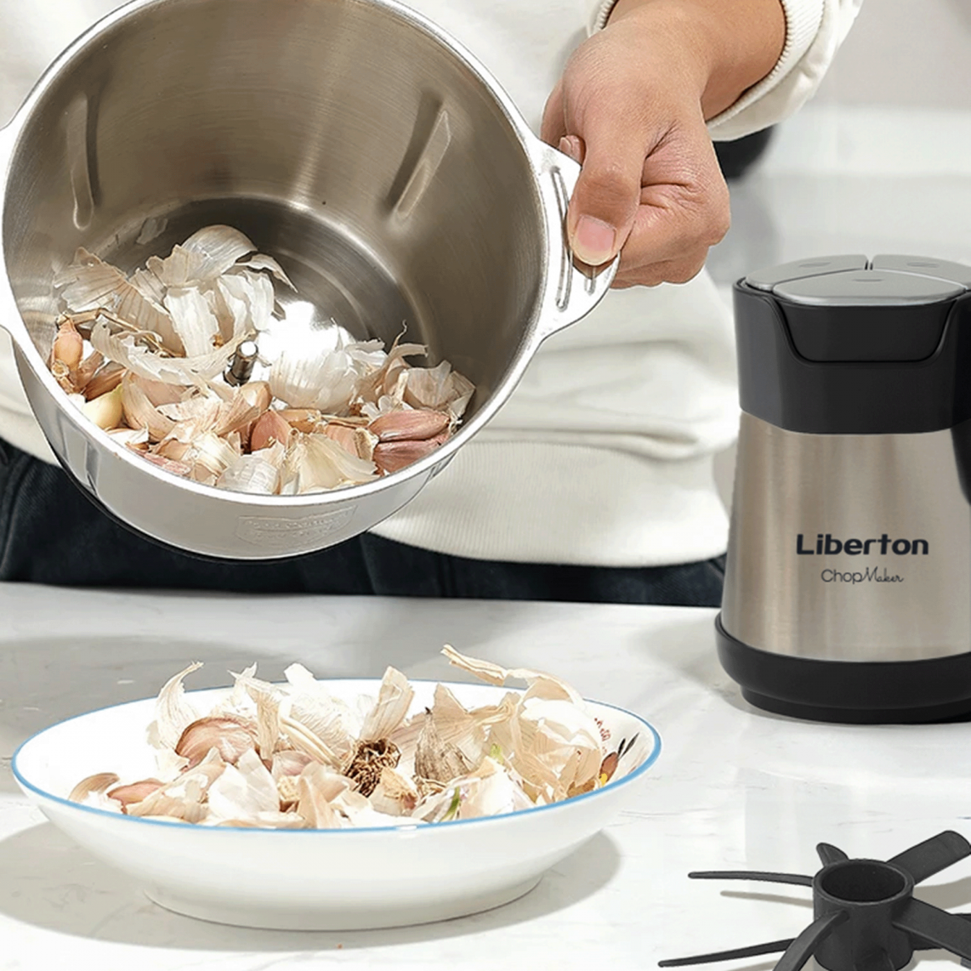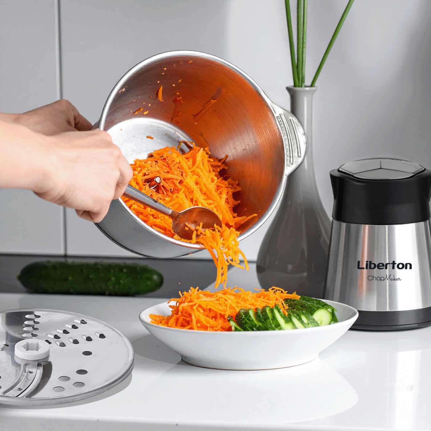 Power: 600 W; Type: stand mixer; Speed settings: 3; Bowl capacity (L): 3; Blade: stainless steel; Body material: stainless steel + plastic; Features: electronic display, 100% copper motor, TURBO mode, anti-slip base; Accessories: double-sided slicing/grating disc, grater disc for potato pancakes, garlic peeler attachment, omelet whisk attachment, disc holder, cleaning spatula.