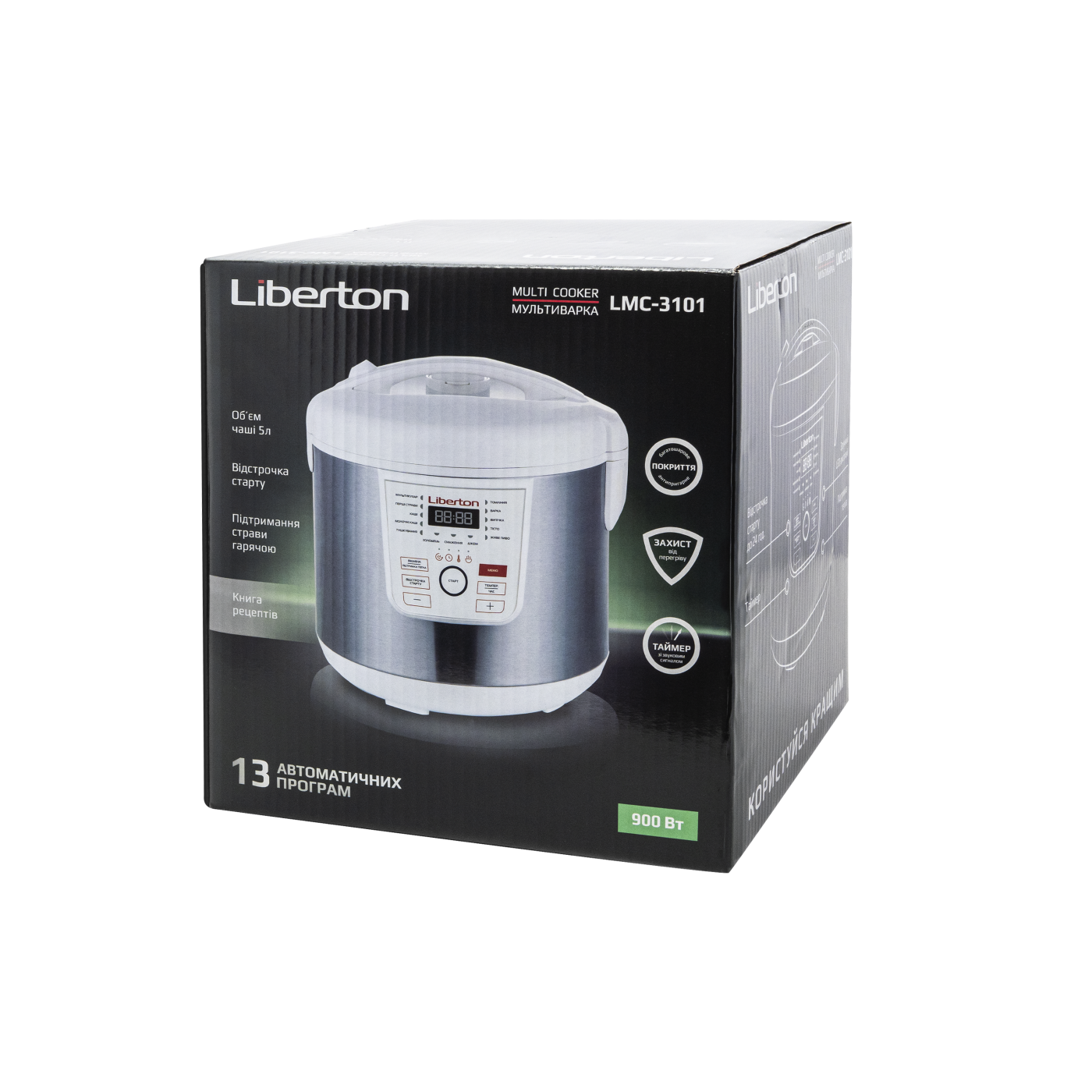 Потужність: 900 Вт; Об'єм чаші: 5 л; Програми: 13; Дисплей: LED; Додаткові функції: підтримка температури, відстрочка старту, паровий клапан, регулювання робочого тиску, захист від перегріву; Комплектація: чаша (з антипригарним покриттям TEFLON), контейнер-пароварка, лопатка, мірний стакан, книга рецептів; Розмір виробу: 26,5х26,5х27 см; Матеріал корпусу: нержавіюча сталь+пластик; Колір: нерж+білий.