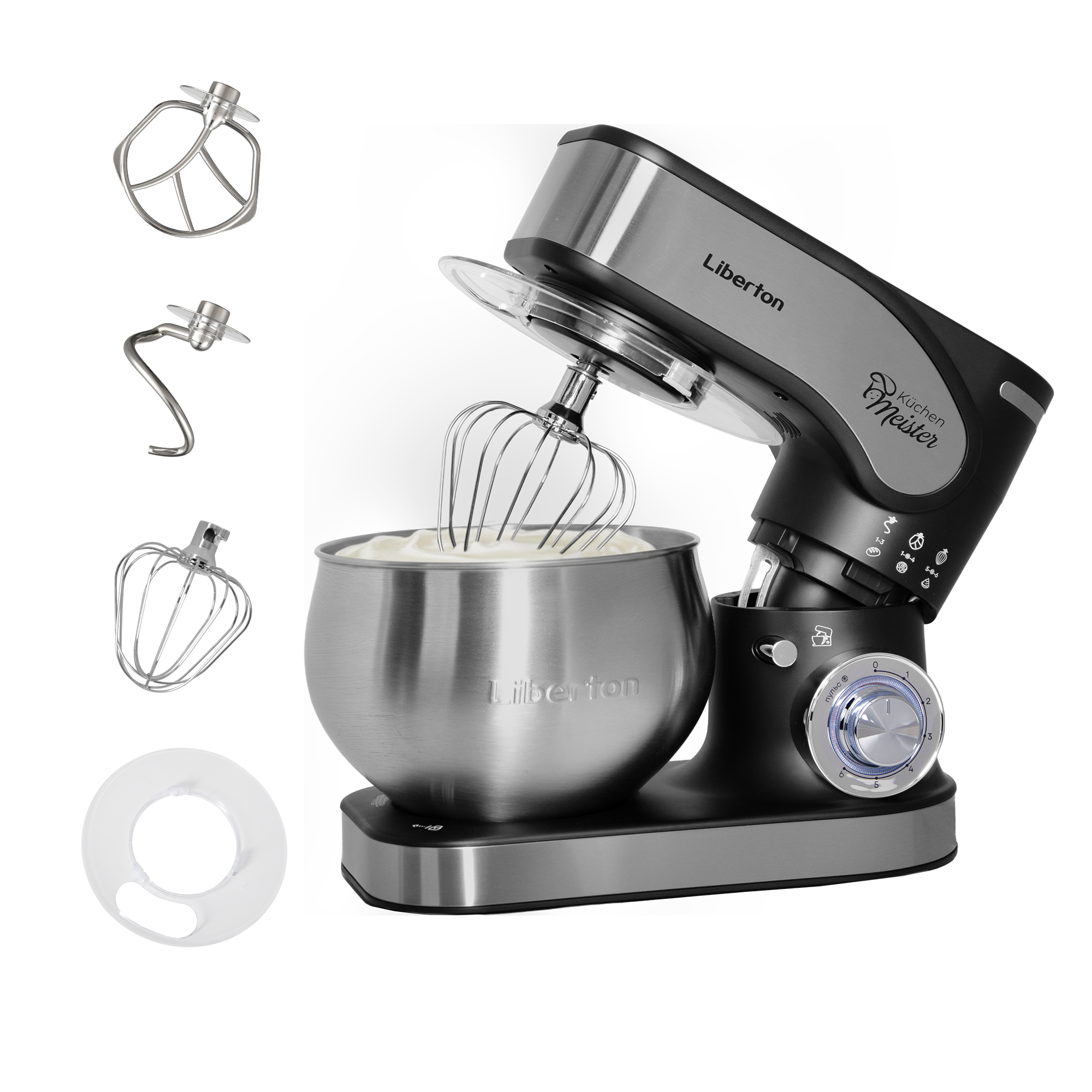 Потужність: 2000 Вт; Кіл-ть швидкостей: 6; Режим "Пульс": так; Насадки: гак для тіста, плоский збивач, вінчик, лопатка з пластику; Матеріал насадок: нержавіюча сталь; Кнопка вилучення насадок: так; Матеріал корпусу: пластик+нержавіюча сталь; Об'єм чаші: 5 л, Матеріал чаші: нержавіюча сталь; Розмір виробу: 37х29х22 см; Колір: чорний + нержавіюча сталь.