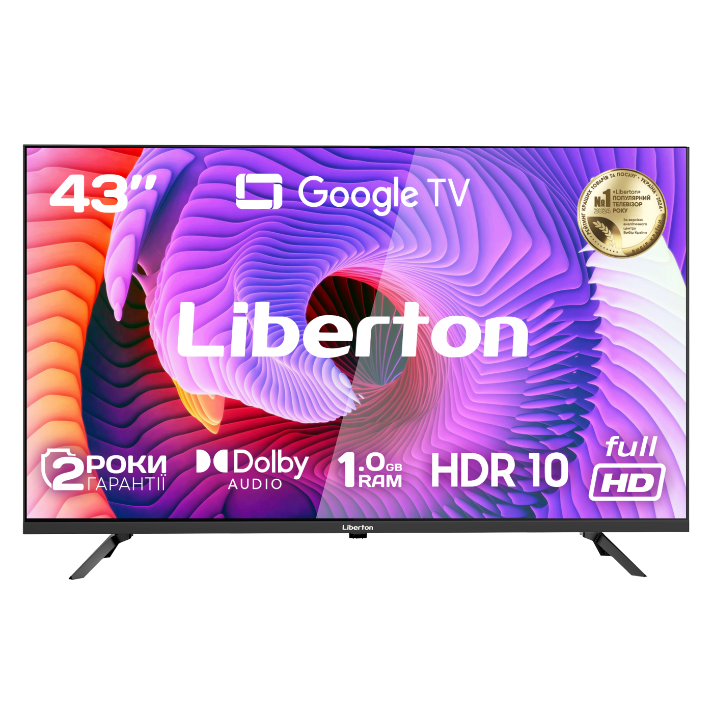 Screen size: 43" (109 cm); Design: frameless; Resolution: 1920x1080 pixels (FULL HD); Operating system: GOOGLE TV; Version: 5.0 (OFFICIAL); Technologies: HDR 10, Dolby Audio, Dolby Digital Plus; RAM: 1 GB; Internal storage: 8 GB; Tuner: DVB-T/C/T2; Viewing angle: 178°; Refresh rate: 60 Hz; Inputs: RF antenna, Ethernet (RJ45), USB, HDMI, composite A/V; Outputs: headphone jack, optical; Sound output: 16 W; Plastic center stand; VESA mount: 200x200 mm; Voice remote control; Color: Black.